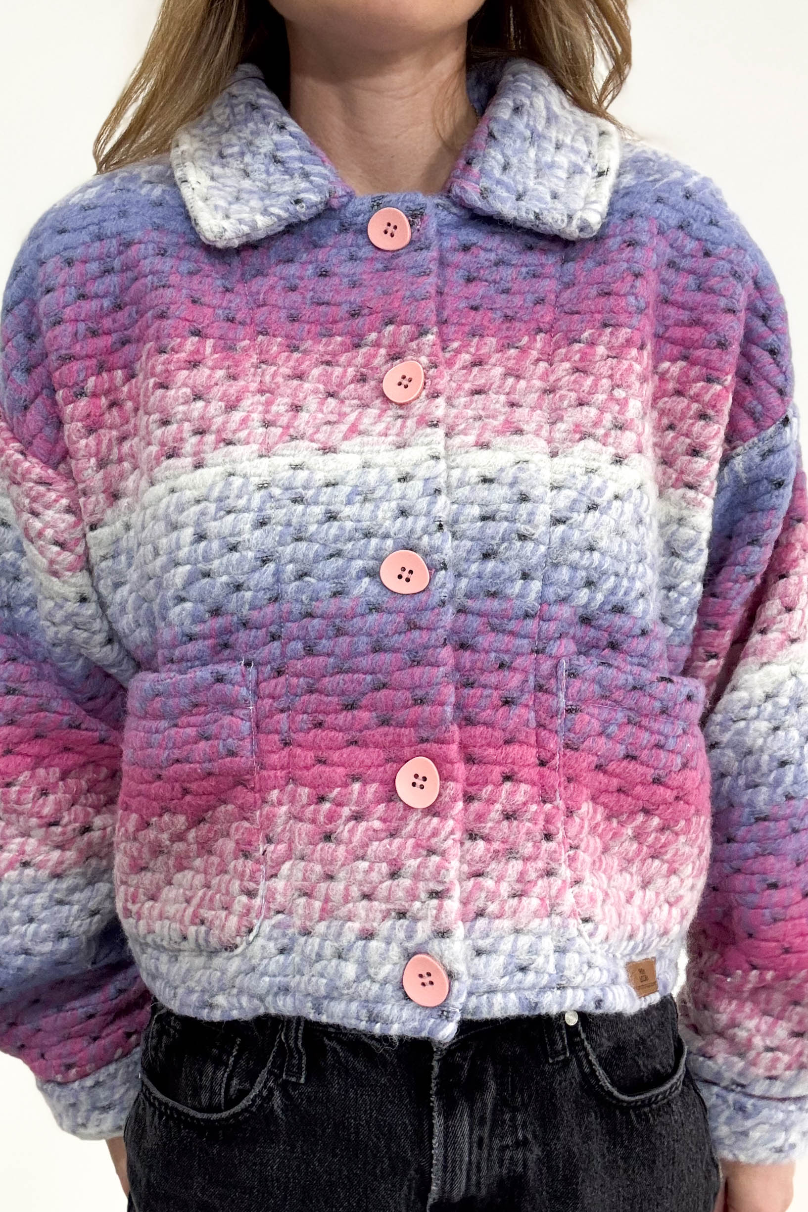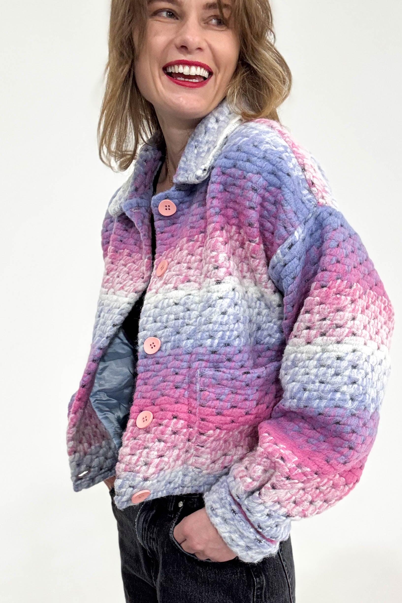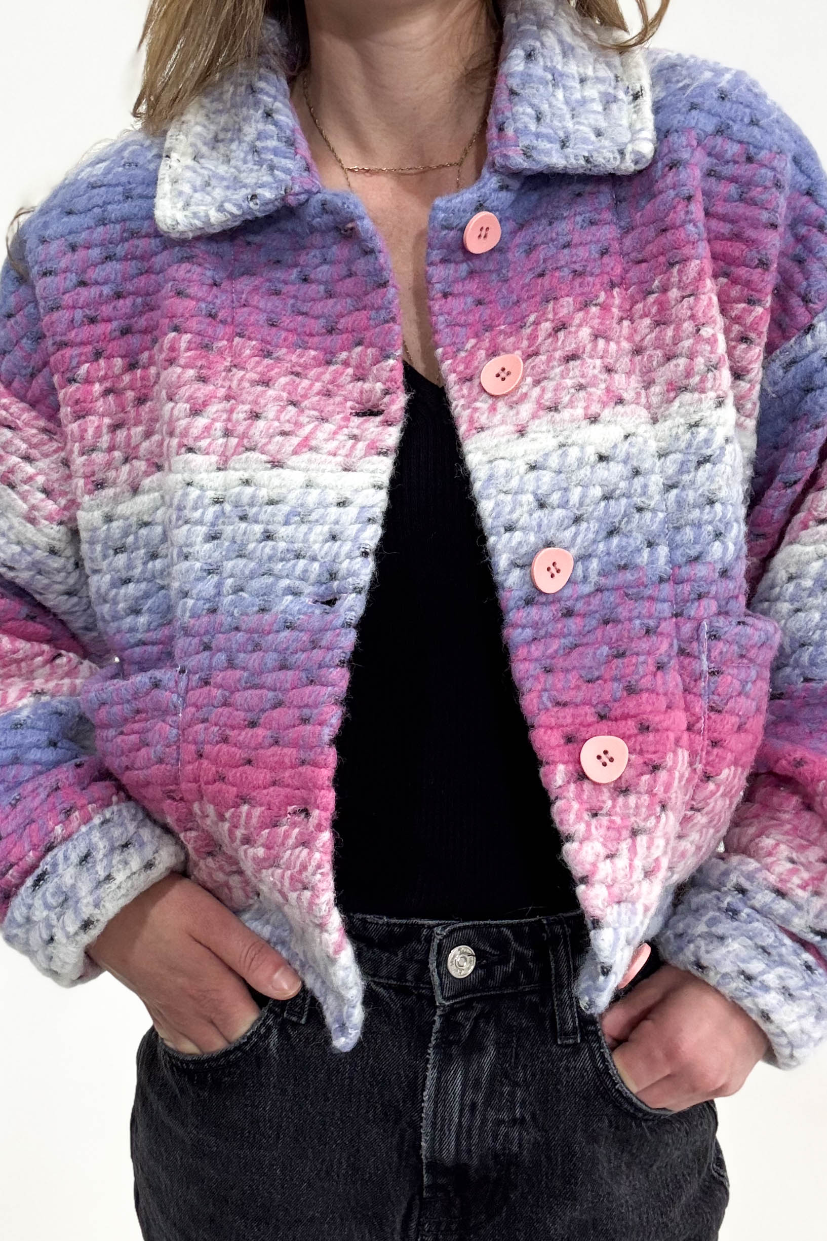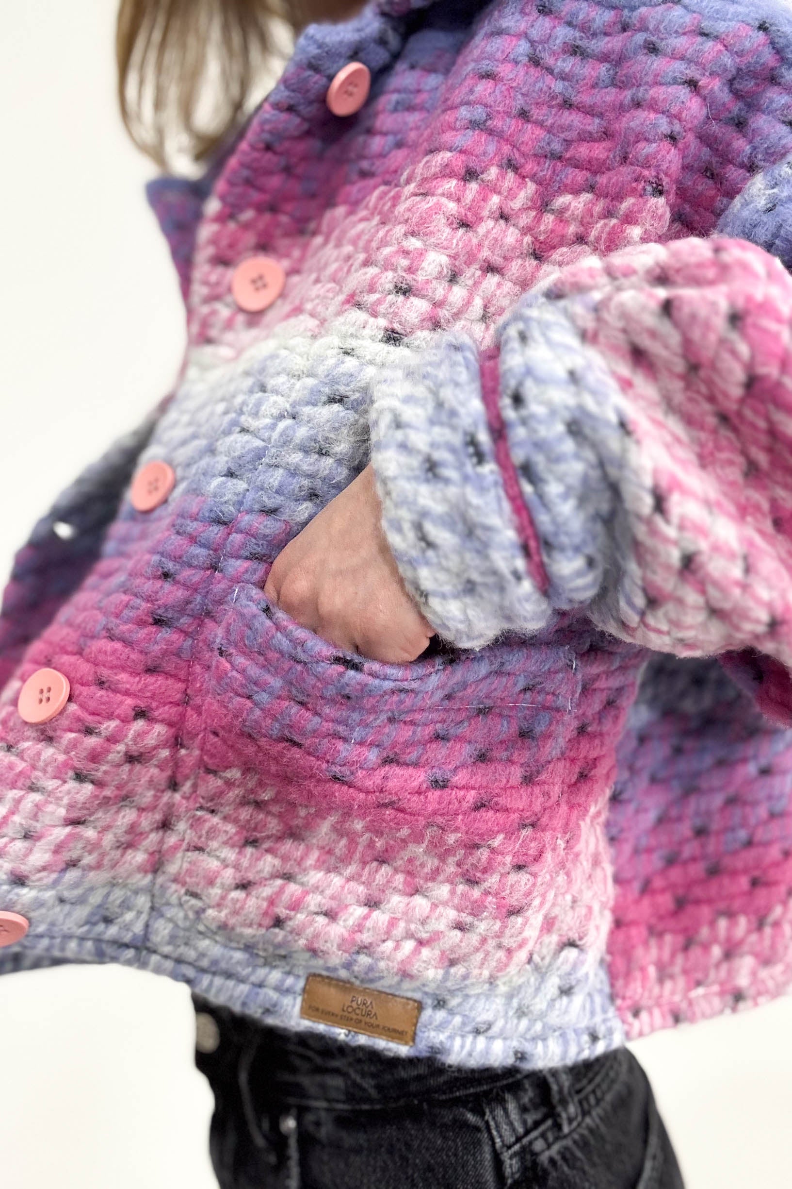 Tento duhový shacket 🌈 upoutá svou originální barevnou hrou v růžovo-fialových tónech, která mu dodává jedinečný charakter a nadčasový vzhled. Je ušitý z kvalitní vlněné kabátoviny 🧶 se svetrovou strukturou, která je volně pletená a příjemně hřejivá. Díky kombinaci vlny a polyacrylu je látka měkká, ale zároveň odolná vůči každodennímu nošení.