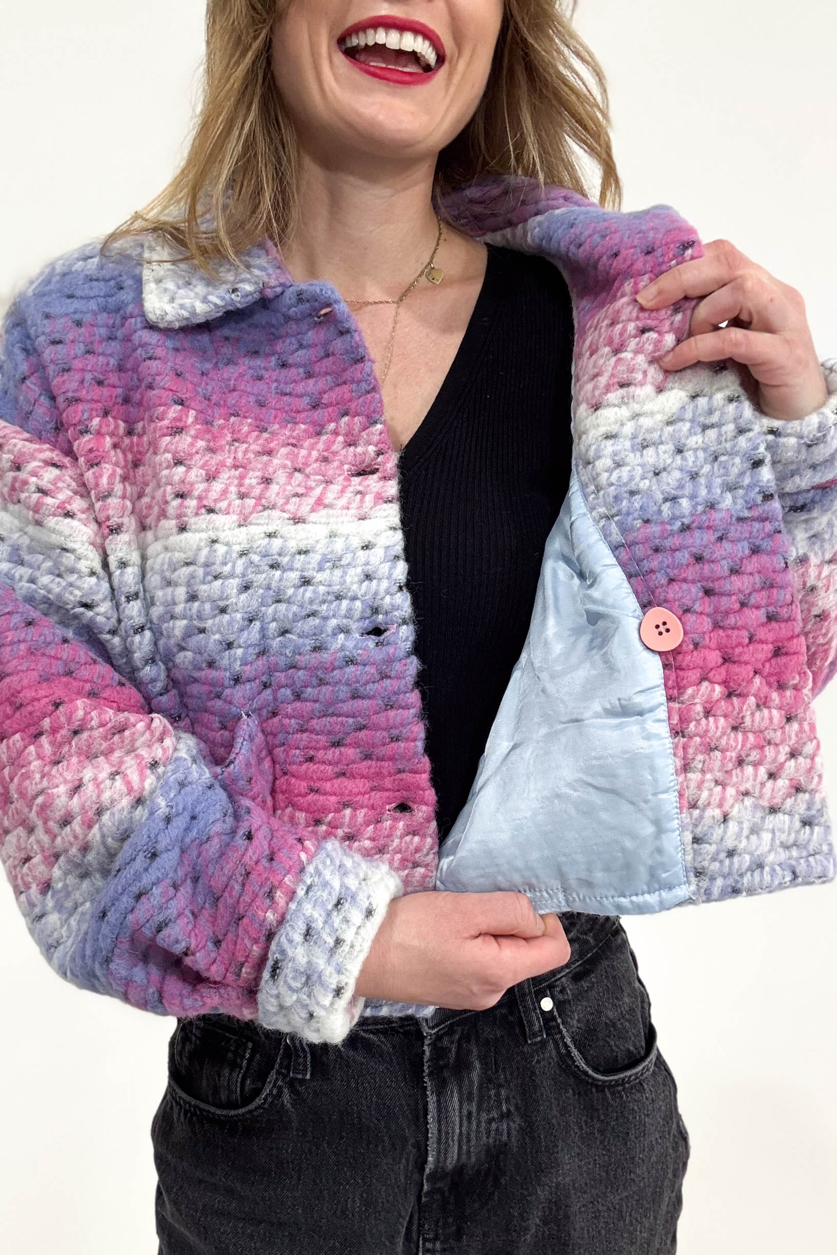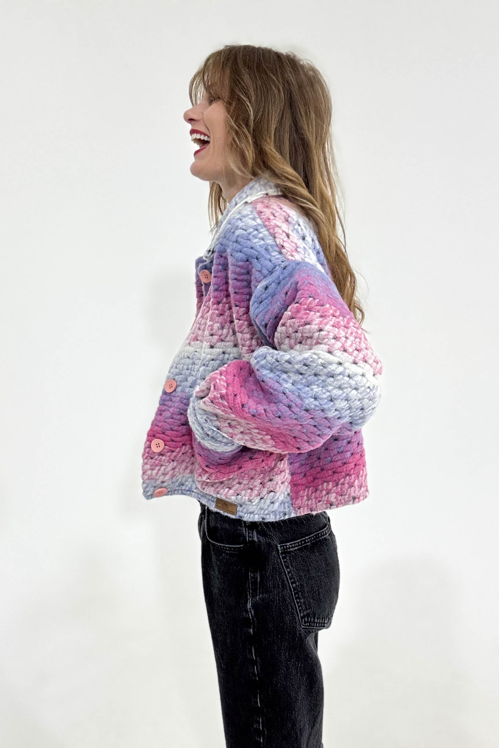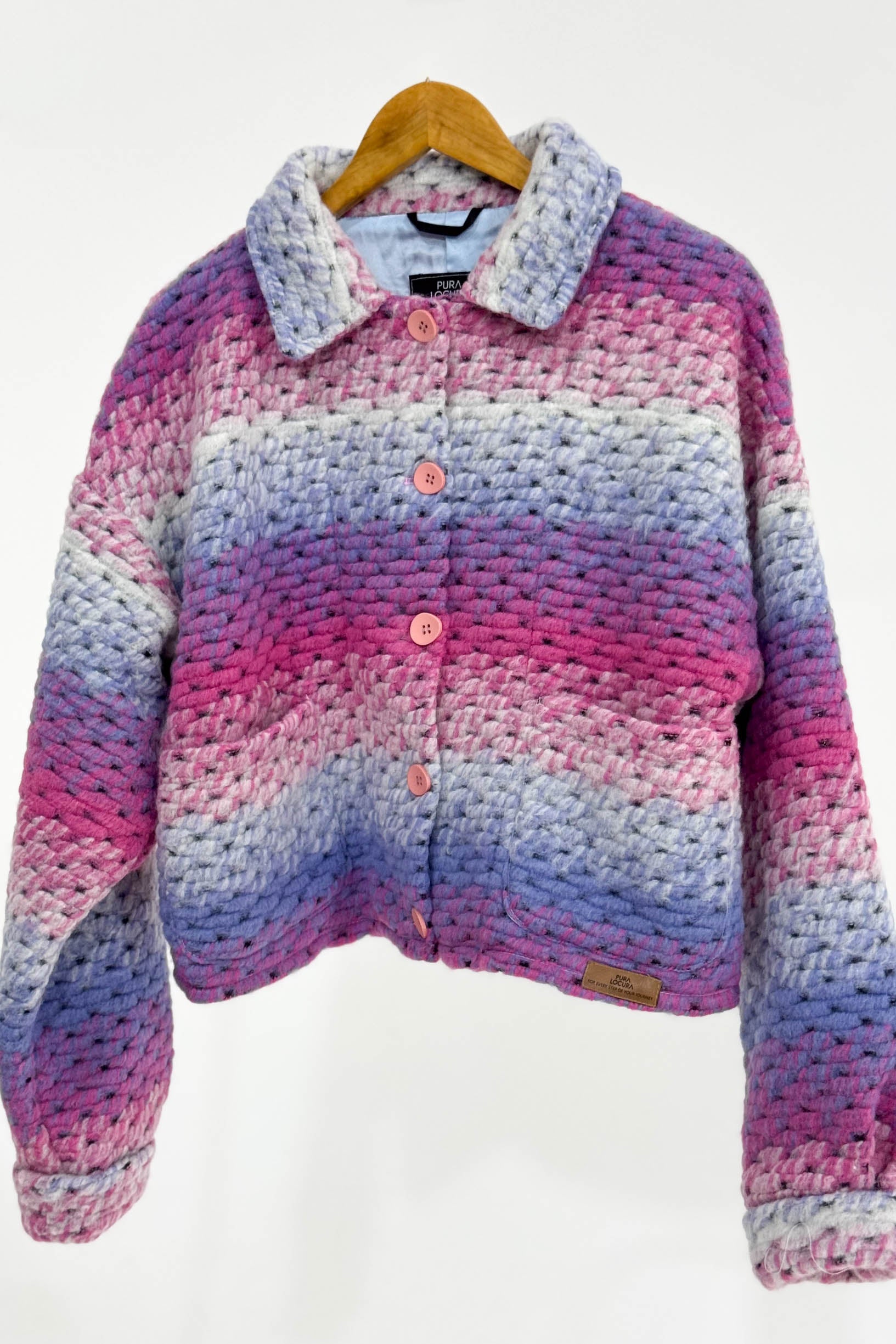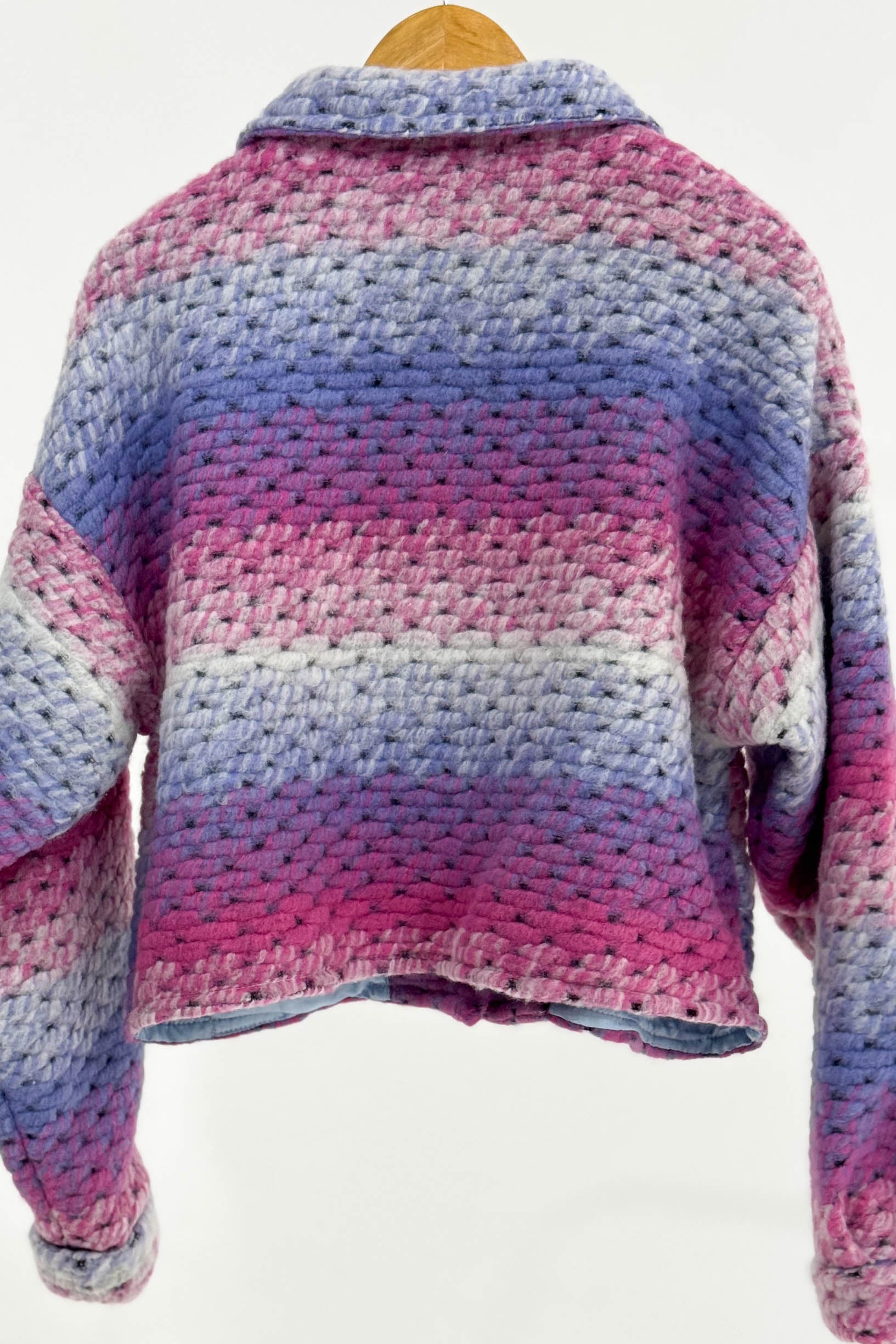 Tento duhový shacket 🌈 upoutá svou originální barevnou hrou v růžovo-fialových tónech, která mu dodává jedinečný charakter a nadčasový vzhled. Je ušitý z kvalitní vlněné kabátoviny 🧶 se svetrovou strukturou, která je volně pletená a příjemně hřejivá. Díky kombinaci vlny a polyacrylu je látka měkká, ale zároveň odolná vůči každodennímu nošení.