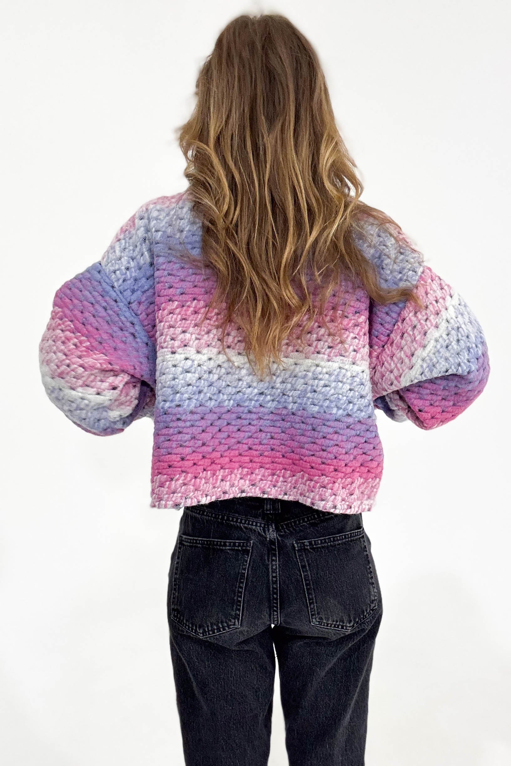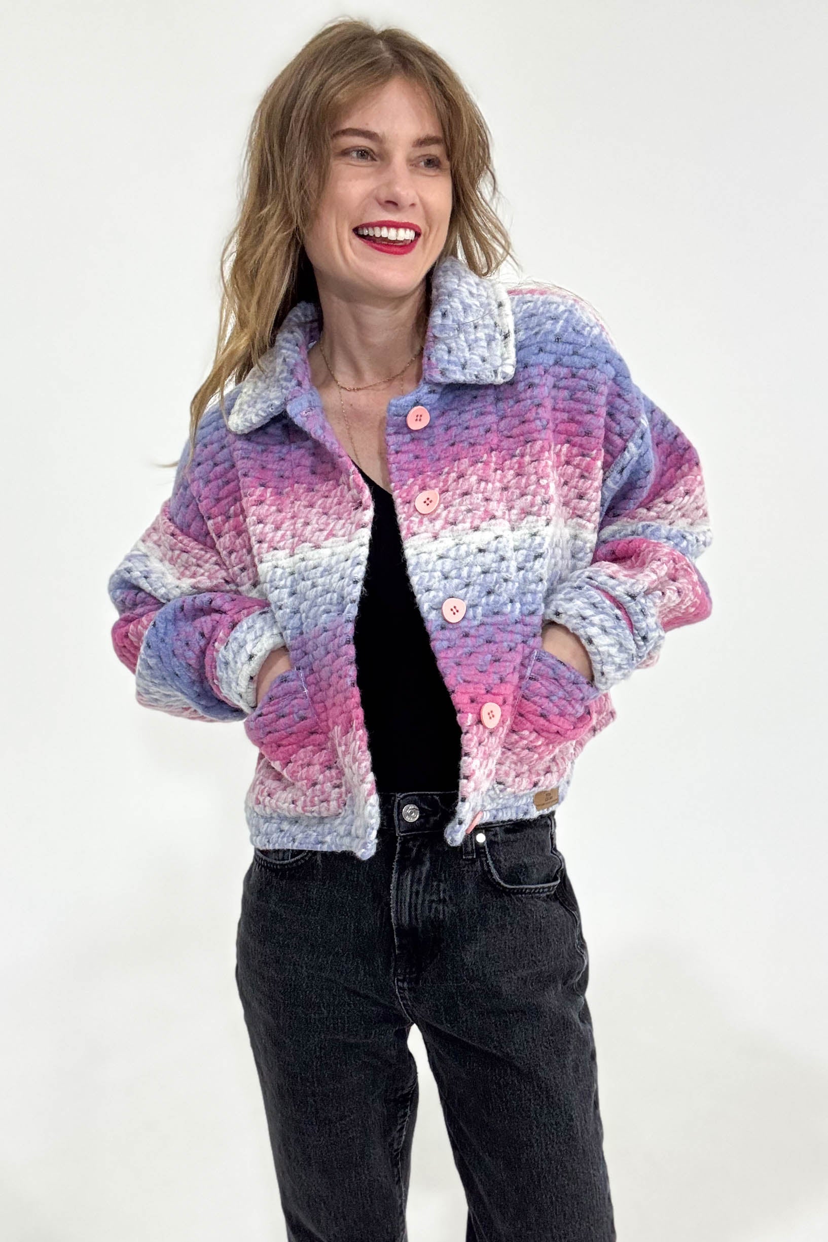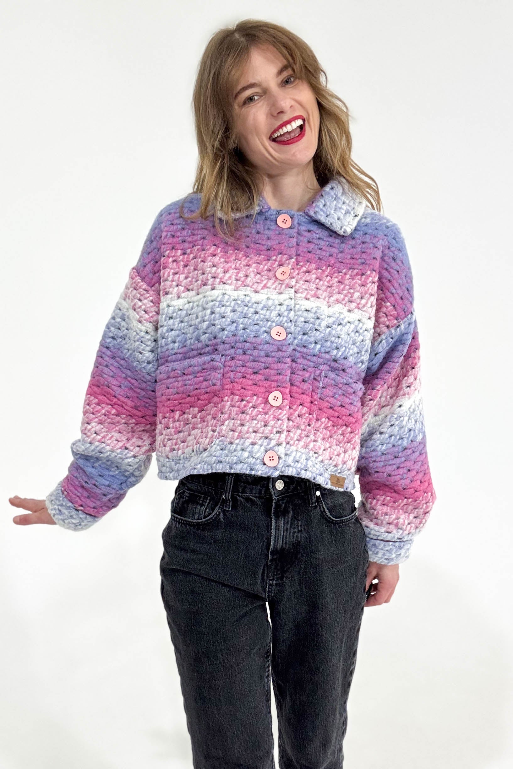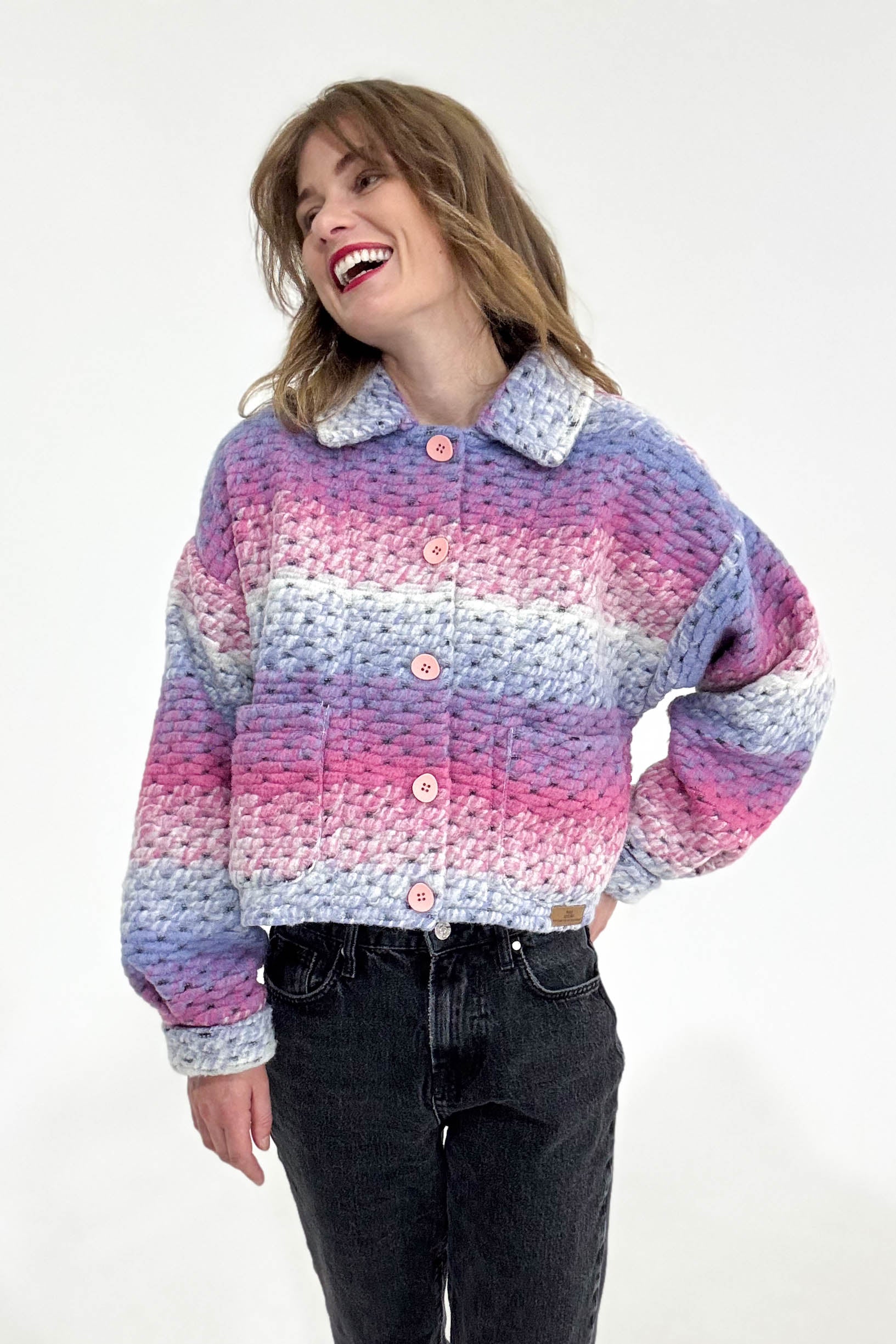 Tento duhový shacket 🌈 upoutá svou originální barevnou hrou v růžovo-fialových tónech, která mu dodává jedinečný charakter a nadčasový vzhled. Je ušitý z kvalitní vlněné kabátoviny 🧶 se svetrovou strukturou, která je volně pletená a příjemně hřejivá. Díky kombinaci vlny a polyacrylu je látka měkká, ale zároveň odolná vůči každodennímu nošení.