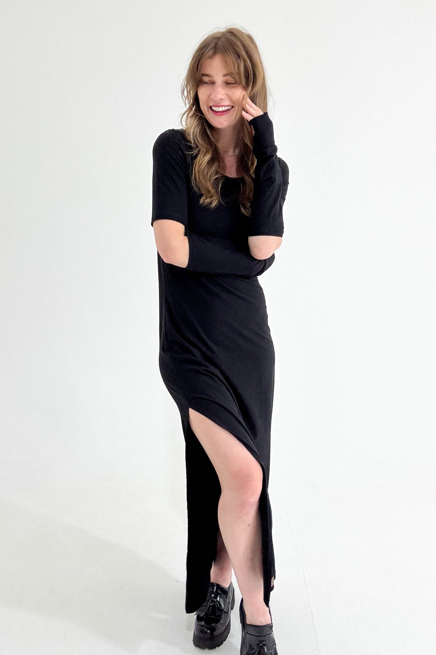 Černé úpletové šaty, které v sobě spojují jednoduchost i rafinované detaily. Smyslný rozparek, elegantní řasení a originální průstřihy na loktech vytváří efekt rukaviček, který zaručeně upoutá pozornost.