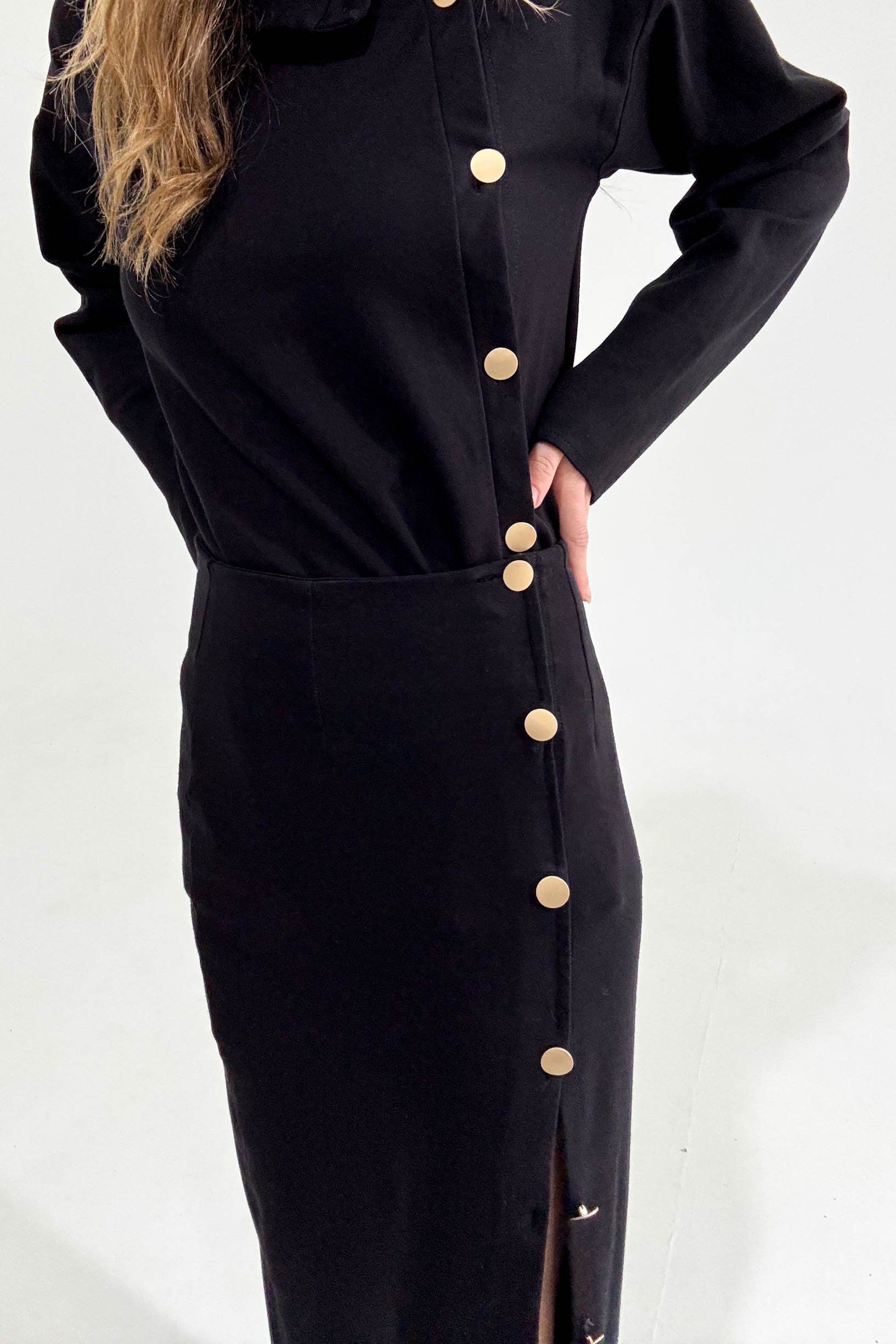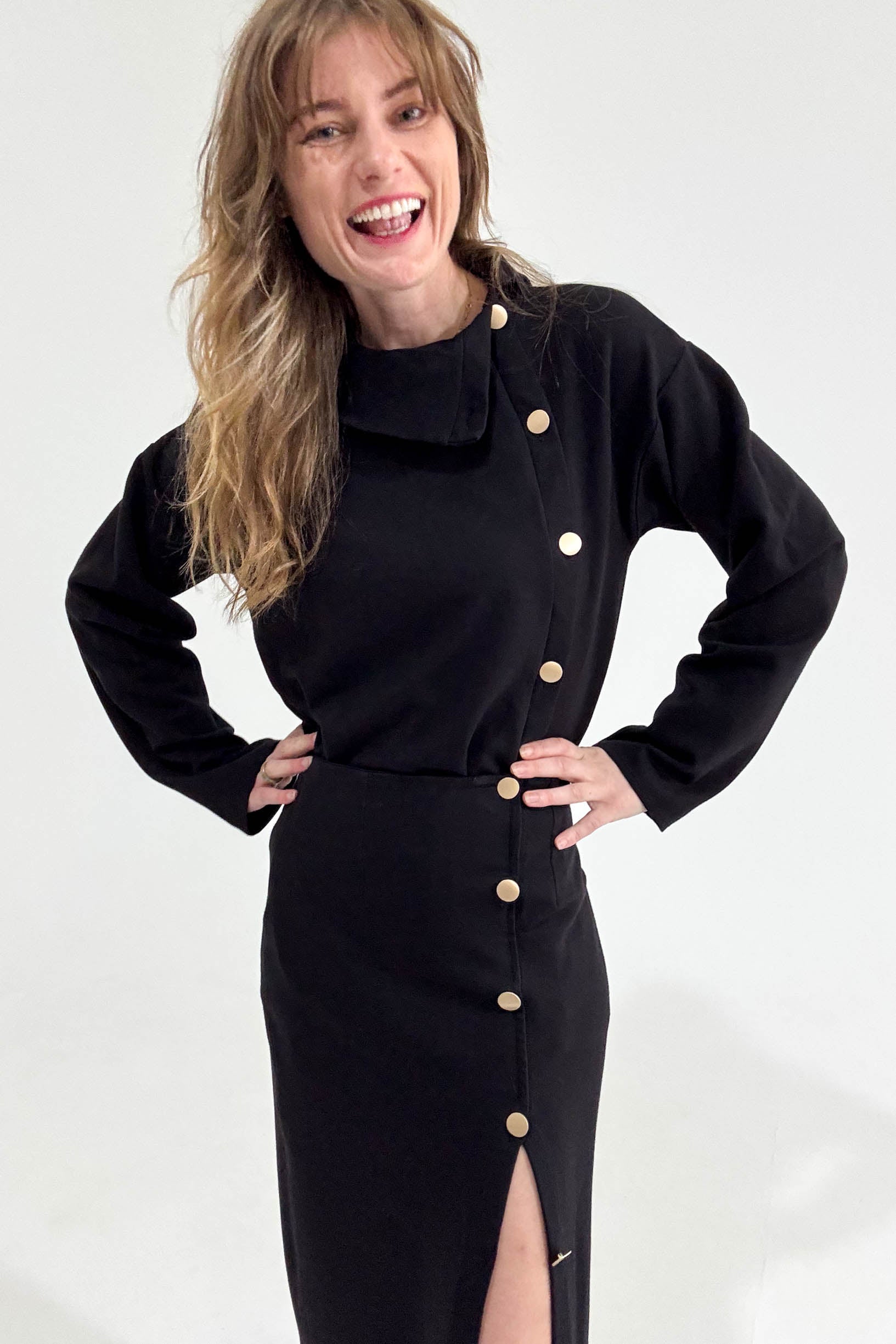 Stylová černá mikina se zlatými detaily, která spojuje pohodlí s elegancí. Díky volnějšímu střihu ji unosíte samostatně i jako součást kompletu se sukní Eterna. ✨