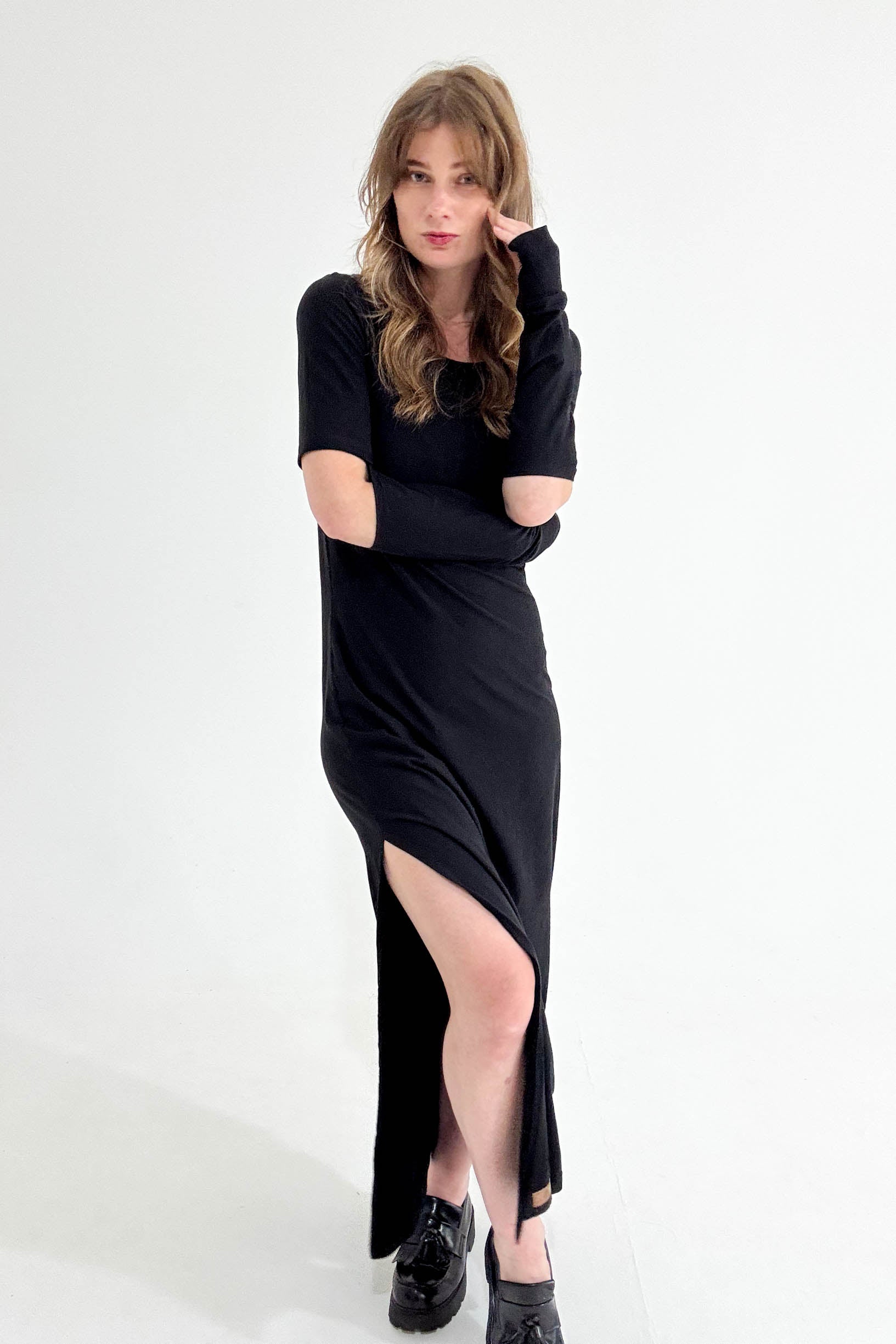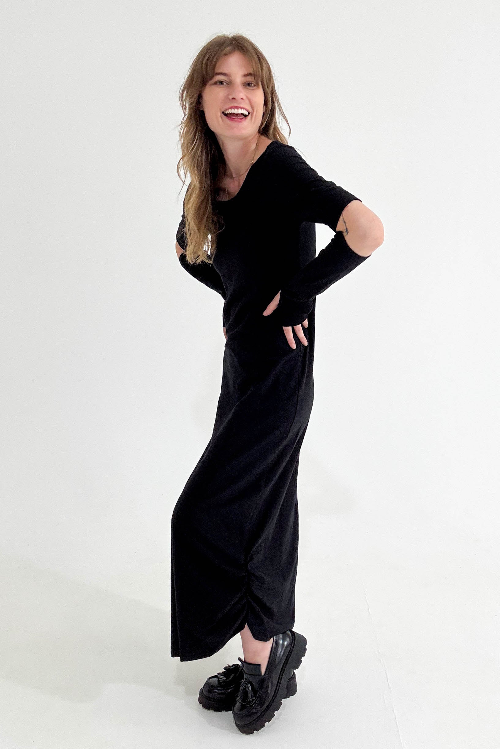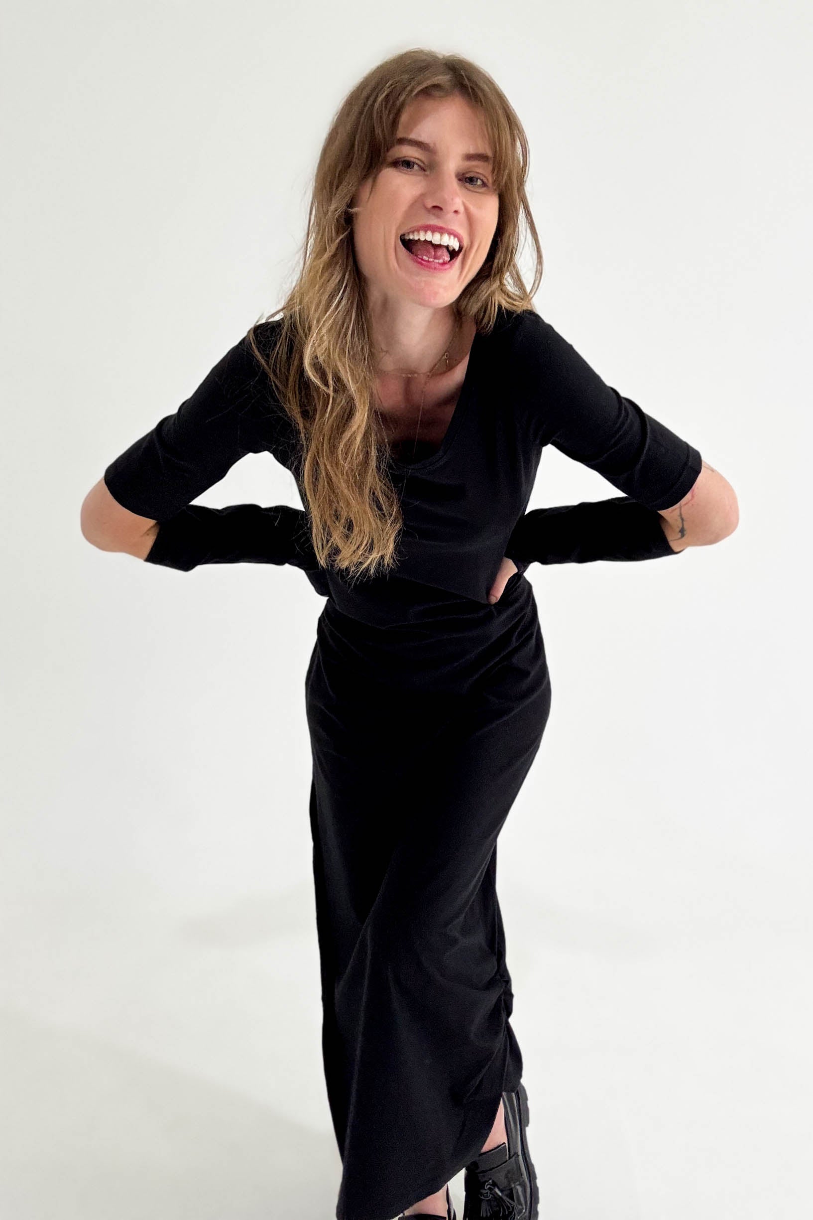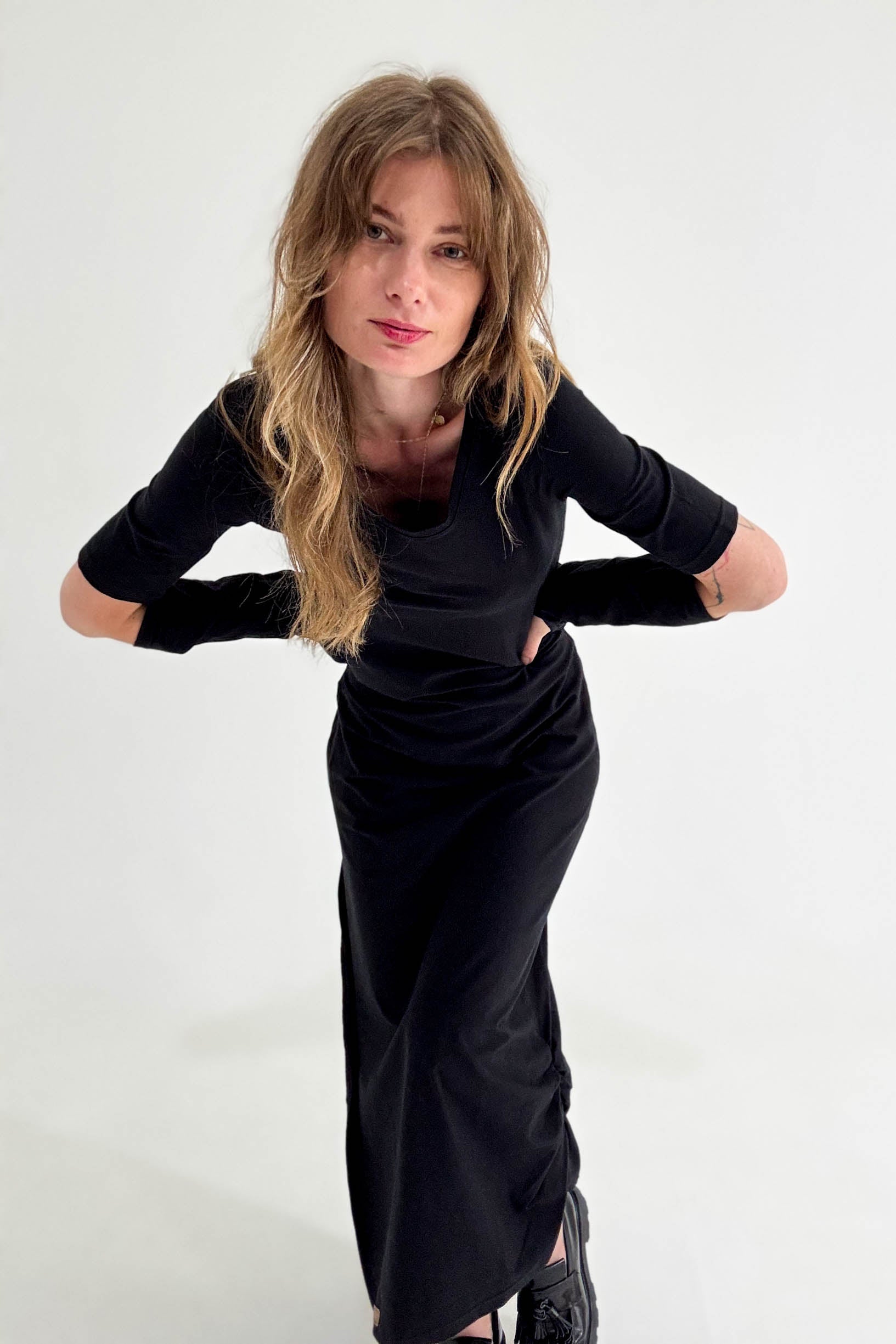 Tyto dlouhé černé šaty z jemného bavlněného úpletu jsou důkazem, že i jednoduchost může být neobyčejně výrazná. Díky řasení na boku krásně kopírují postavu a lichotí siluetě, zatímco rozparek na druhé straně dodává lehkost a ženskou smyslnost.