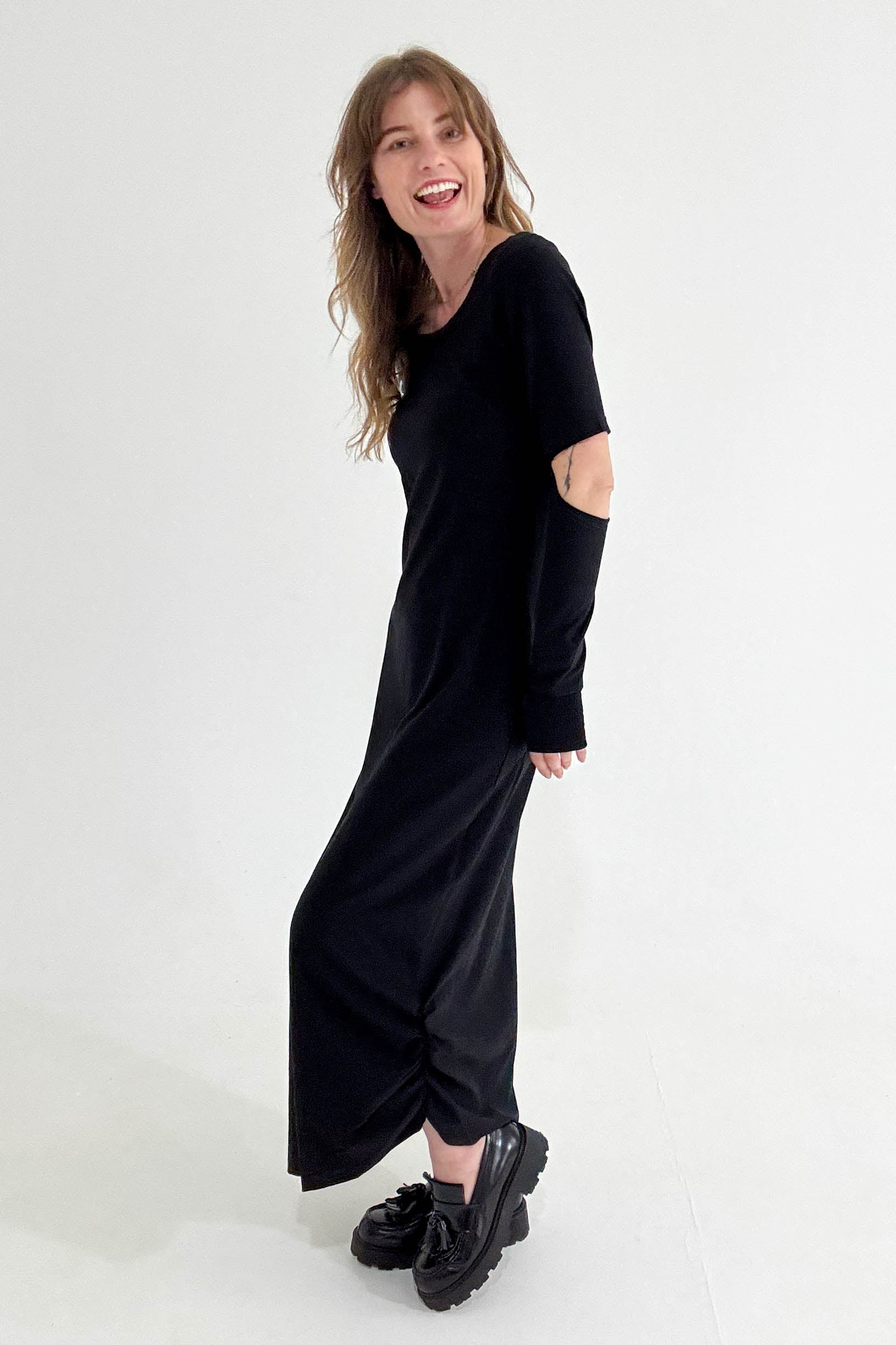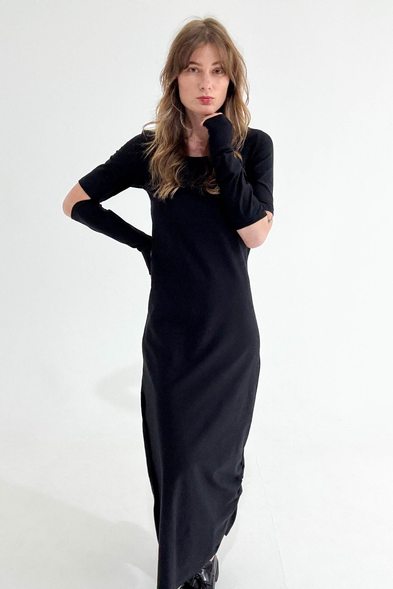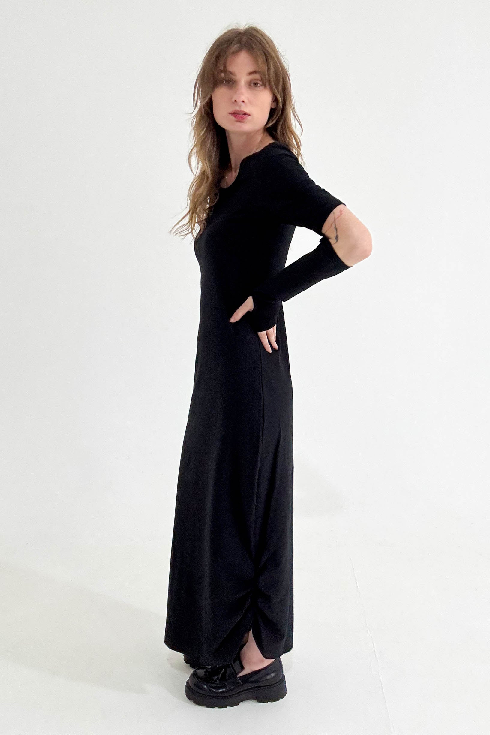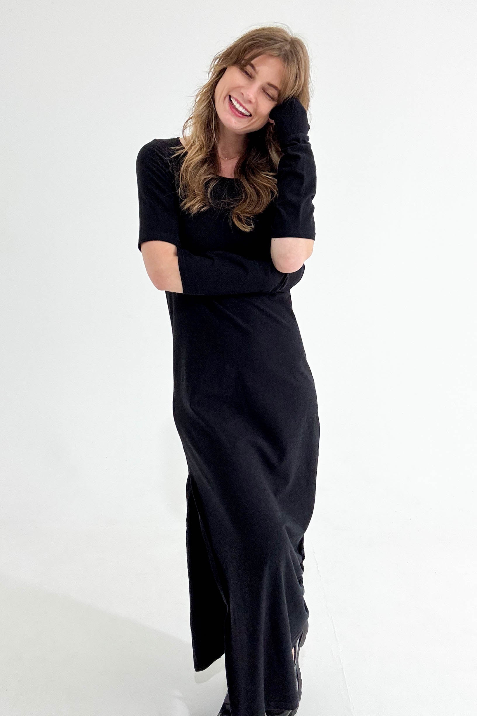 Tyto dlouhé černé šaty z jemného bavlněného úpletu jsou důkazem, že i jednoduchost může být neobyčejně výrazná. Díky řasení na boku krásně kopírují postavu a lichotí siluetě, zatímco rozparek na druhé straně dodává lehkost a ženskou smyslnost.