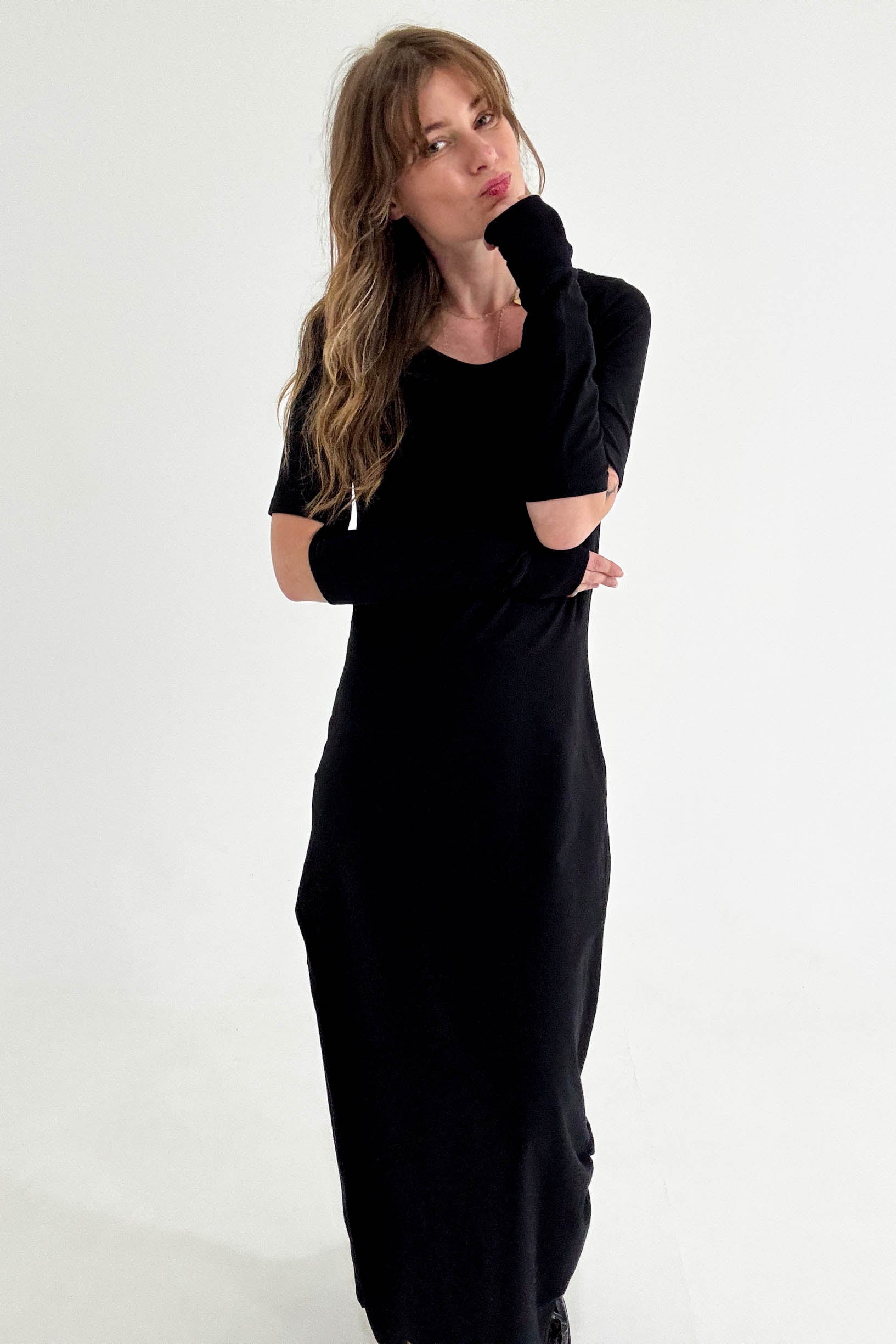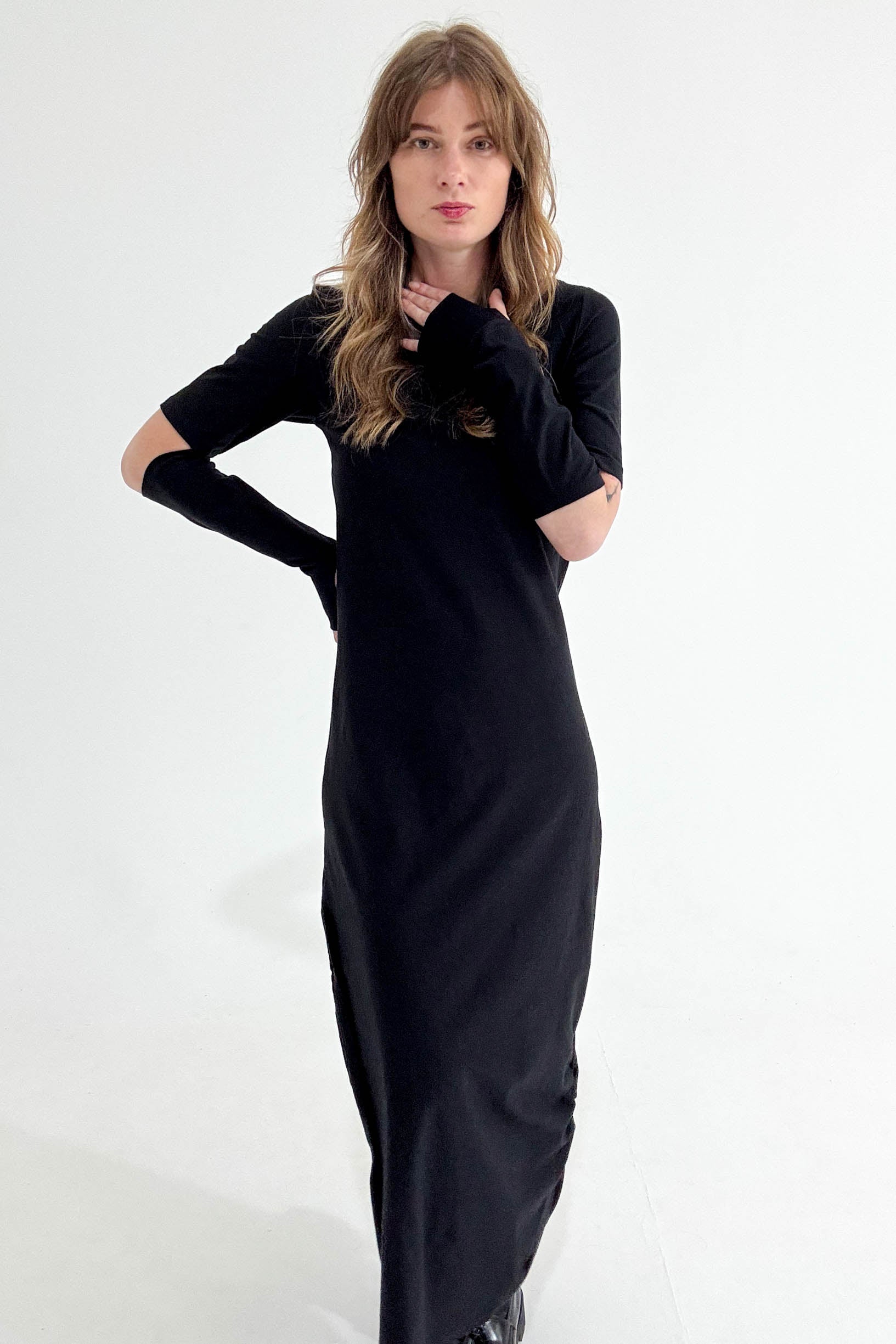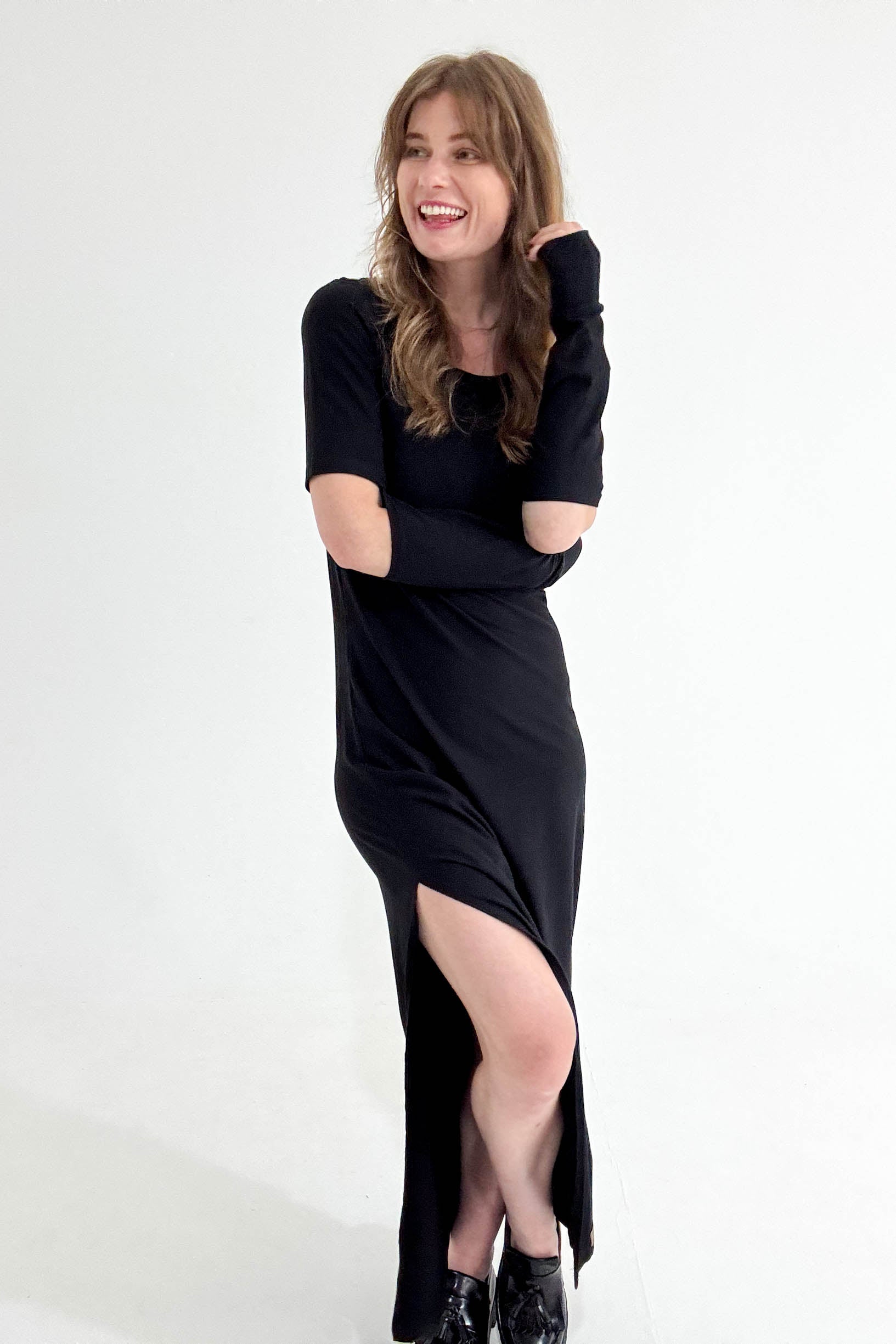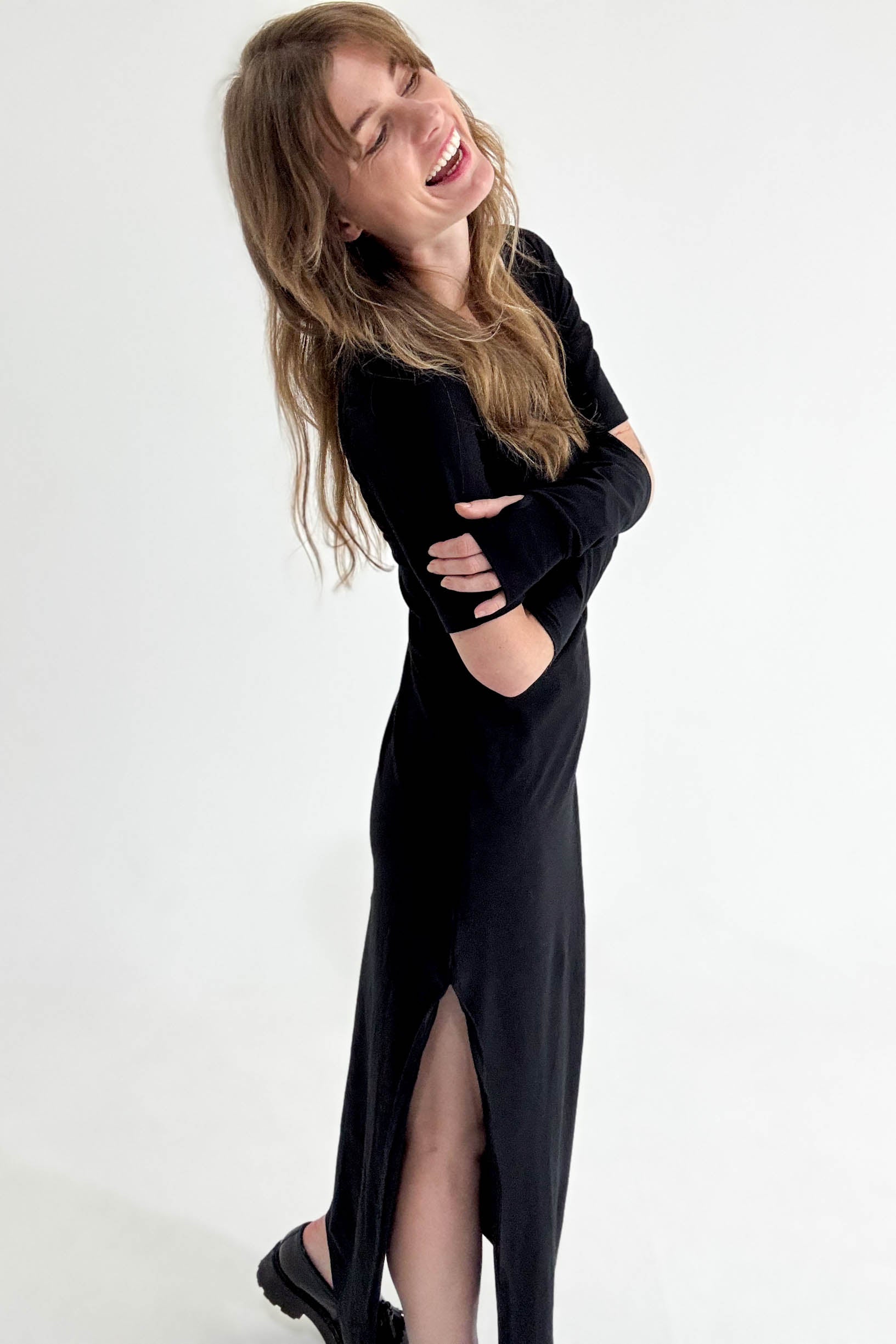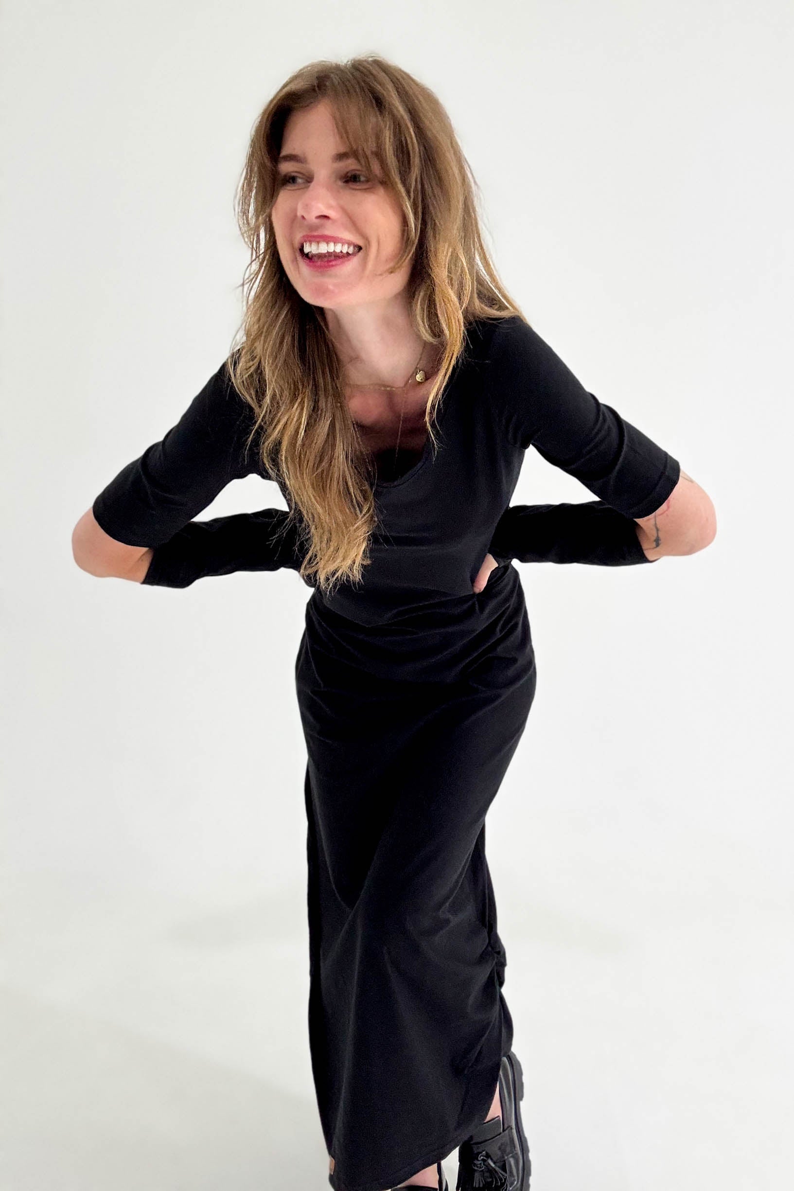 Tyto dlouhé černé šaty z jemného bavlněného úpletu jsou důkazem, že i jednoduchost může být neobyčejně výrazná. Díky řasení na boku krásně kopírují postavu a lichotí siluetě, zatímco rozparek na druhé straně dodává lehkost a ženskou smyslnost.