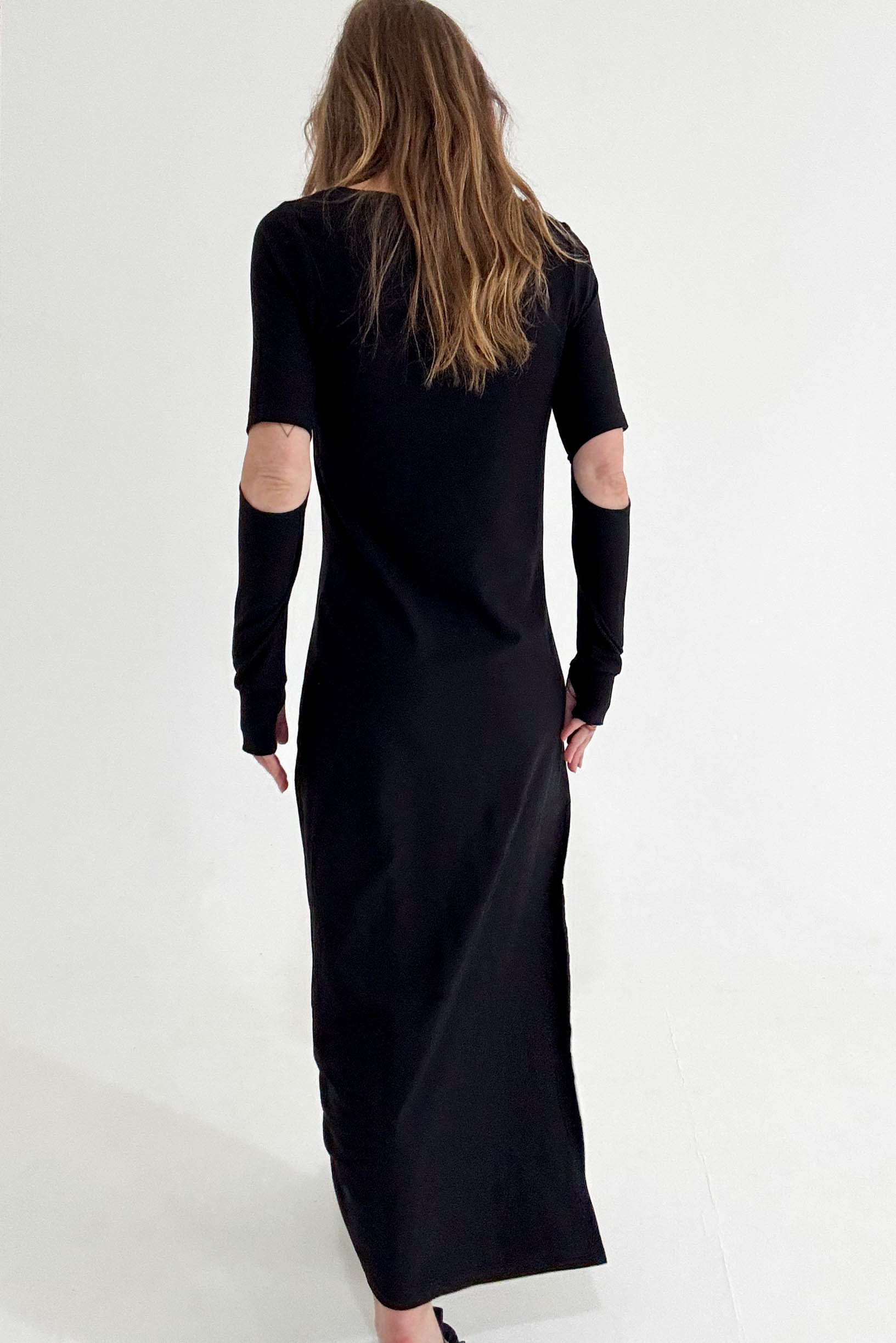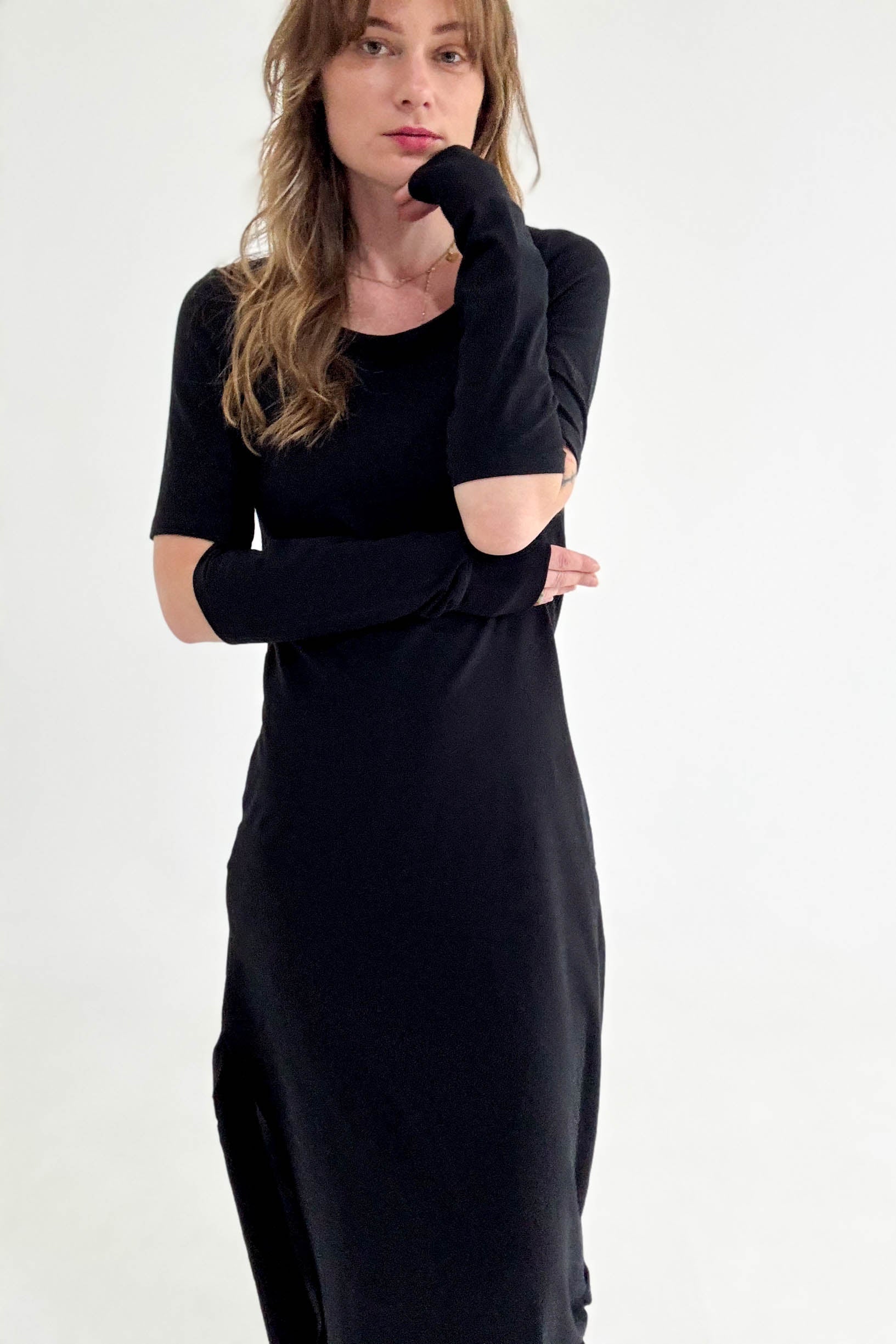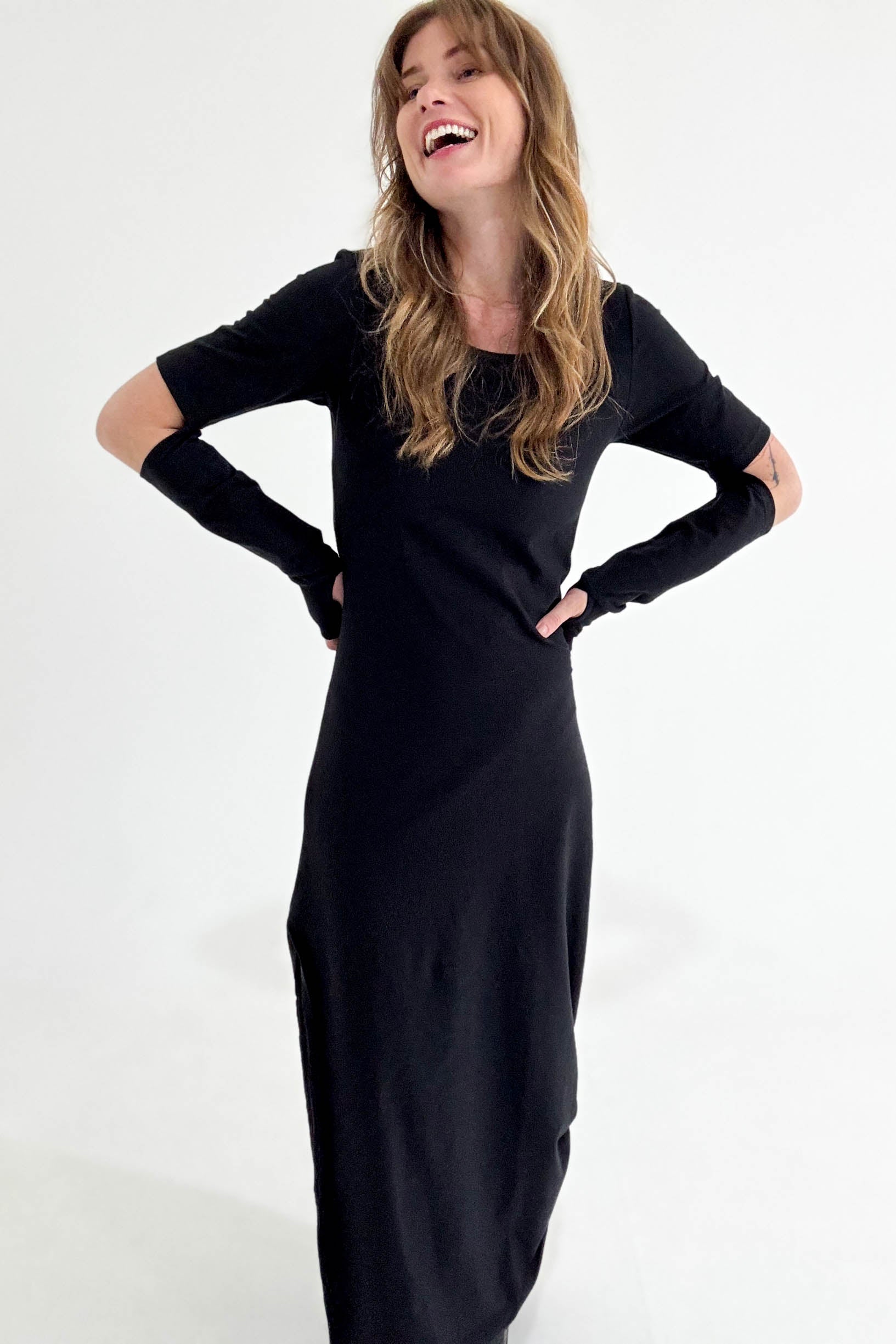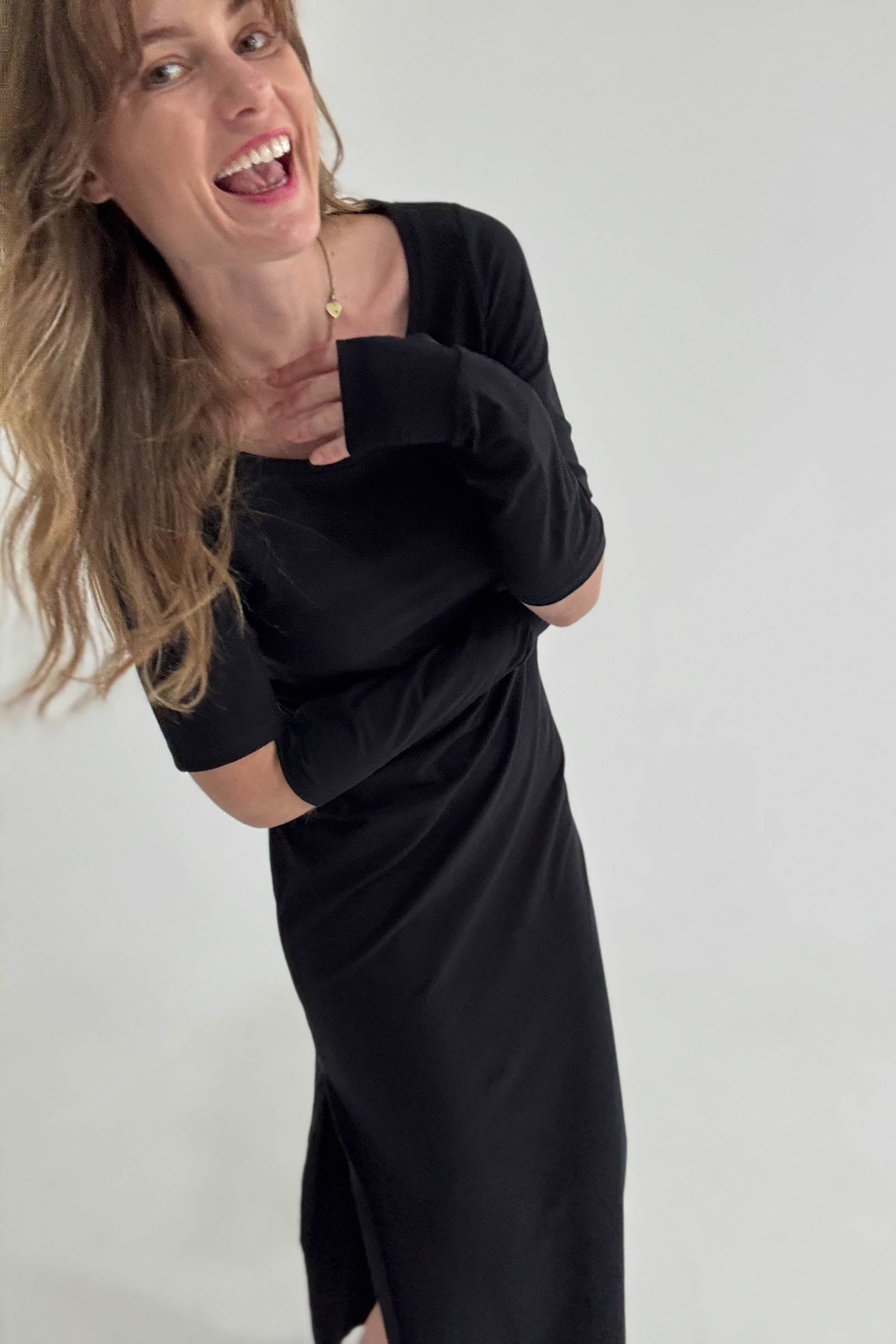 Tyto dlouhé černé šaty z jemného bavlněného úpletu jsou důkazem, že i jednoduchost může být neobyčejně výrazná. Díky řasení na boku krásně kopírují postavu a lichotí siluetě, zatímco rozparek na druhé straně dodává lehkost a ženskou smyslnost.