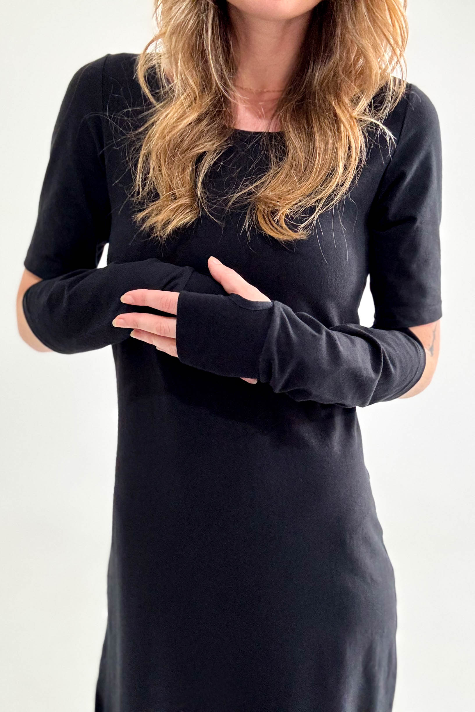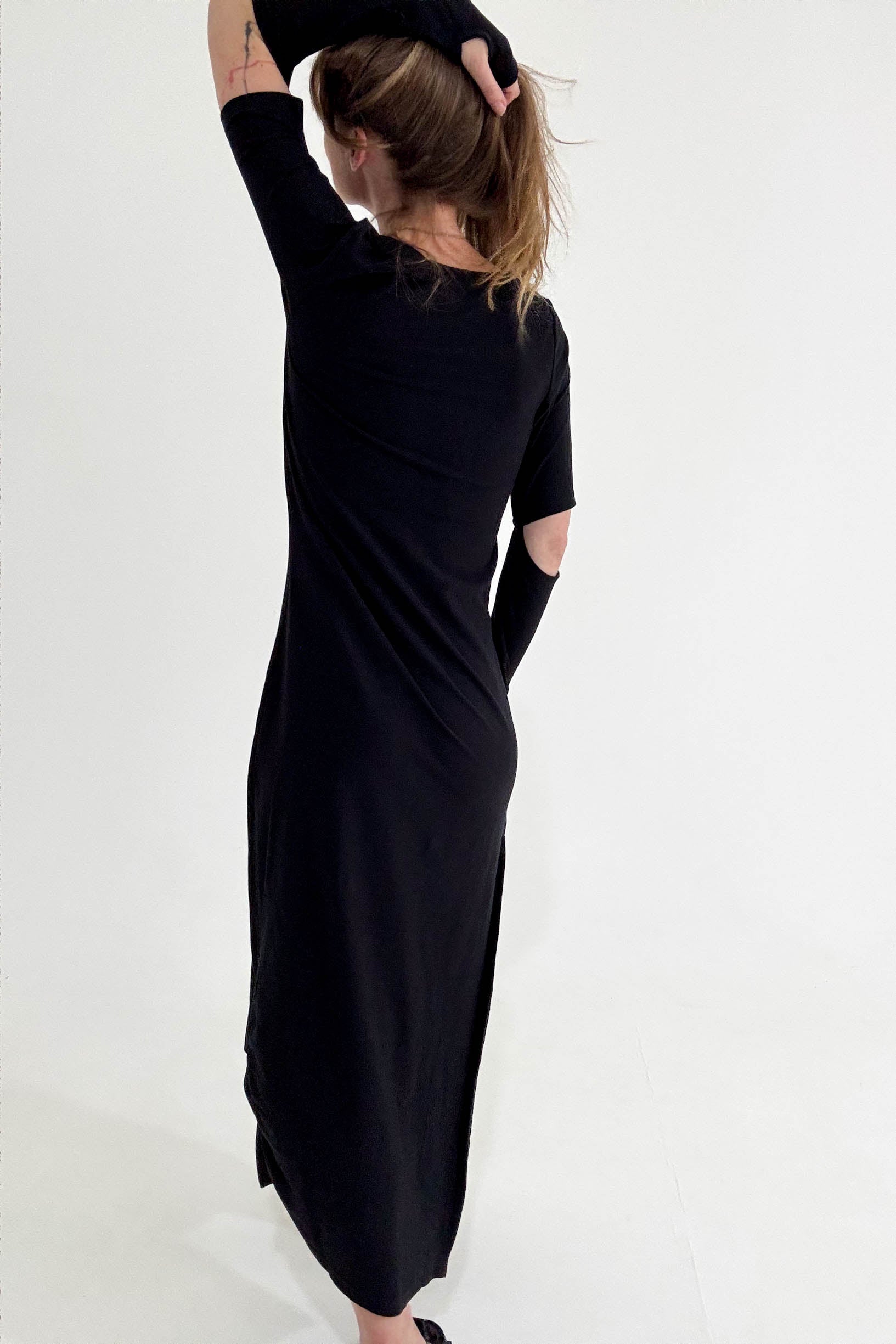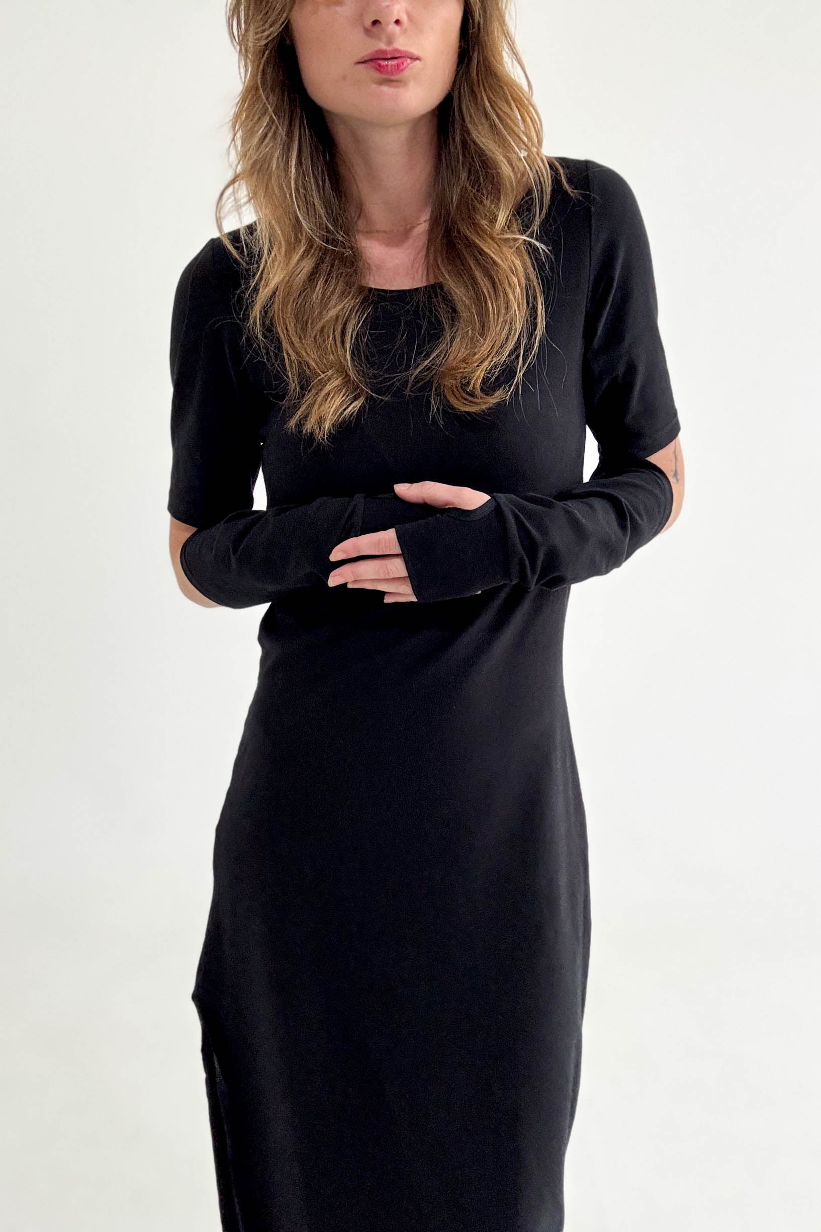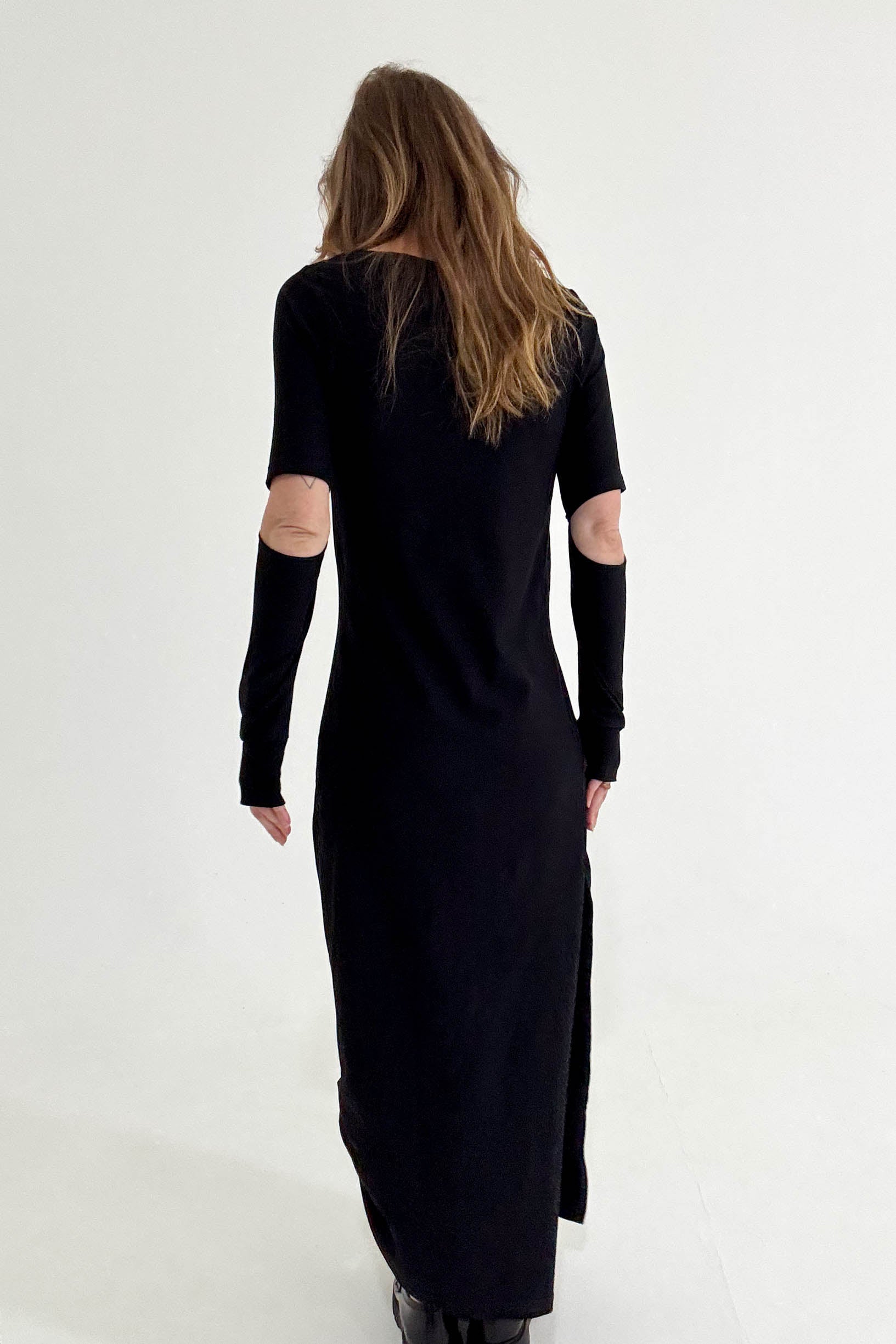Černé úpletové šaty, které v sobě spojují jednoduchost i rafinované detaily. Smyslný rozparek, elegantní řasení a originální průstřihy na loktech vytváří efekt rukaviček, který zaručeně upoutá pozornost.