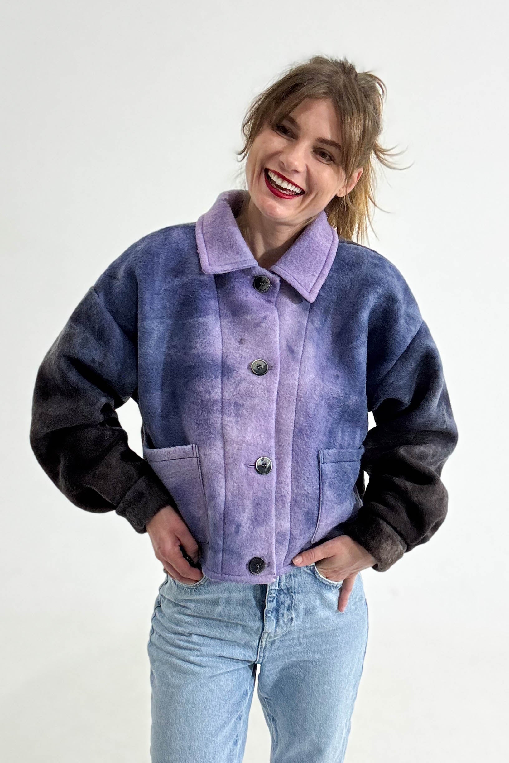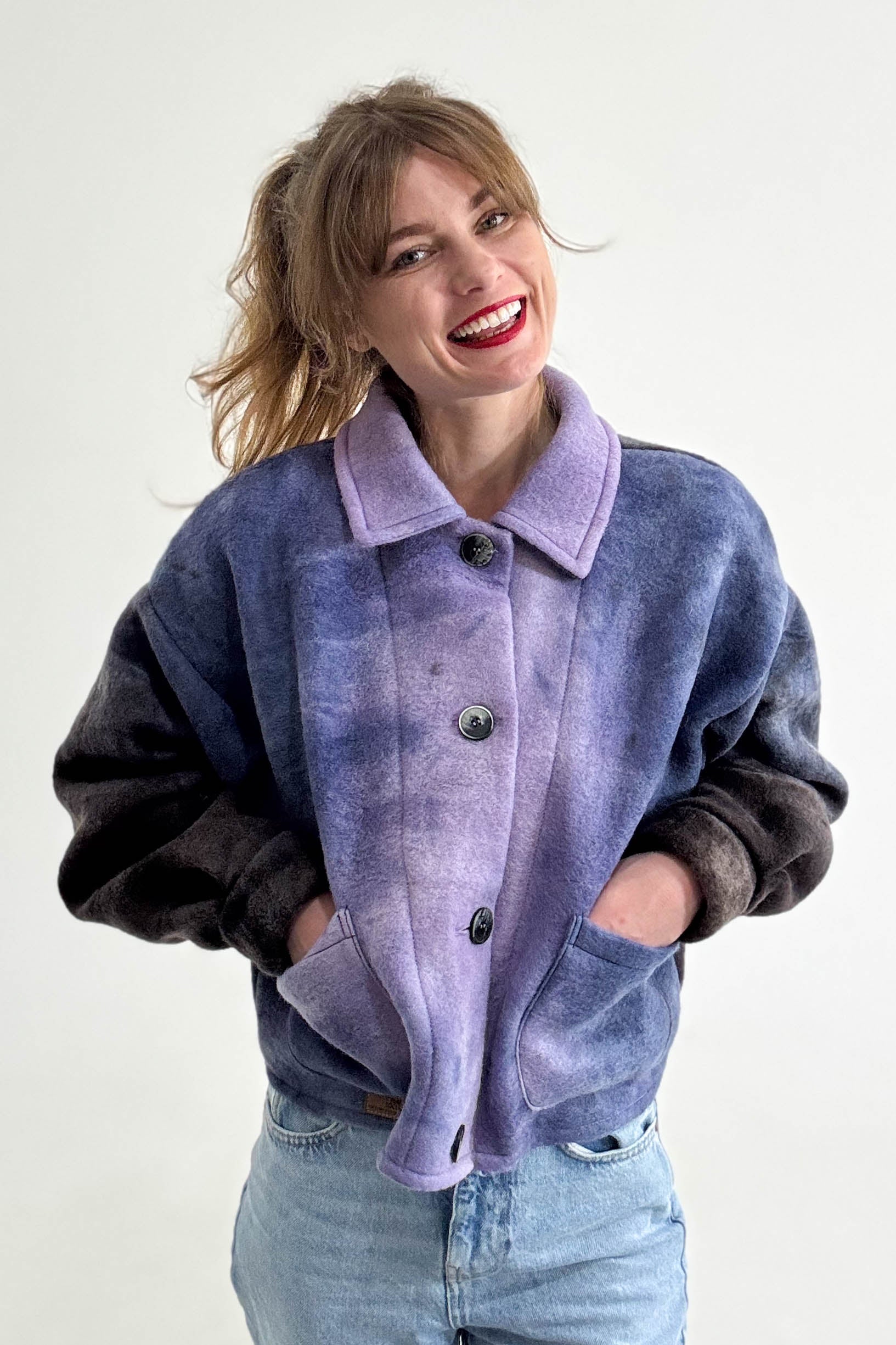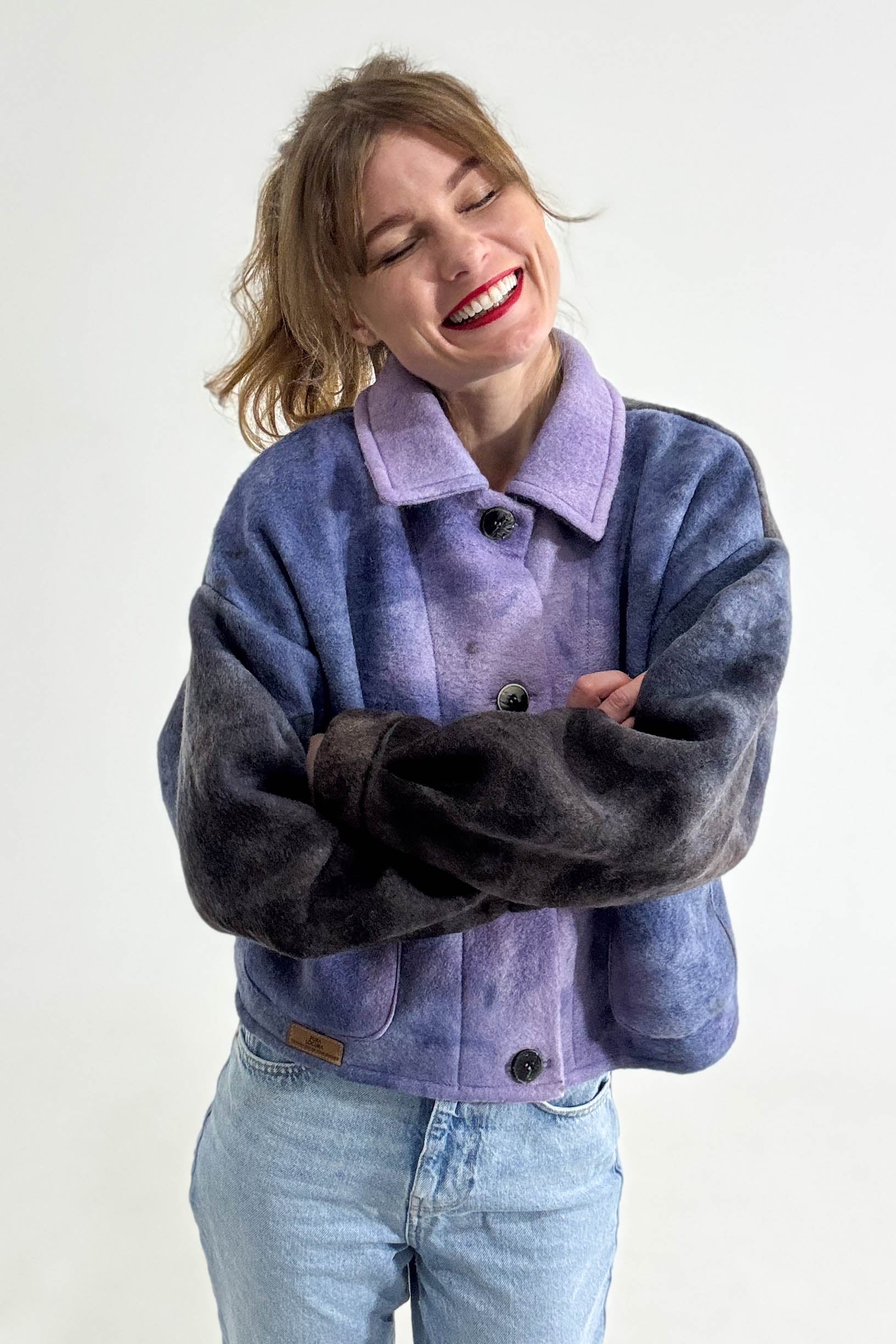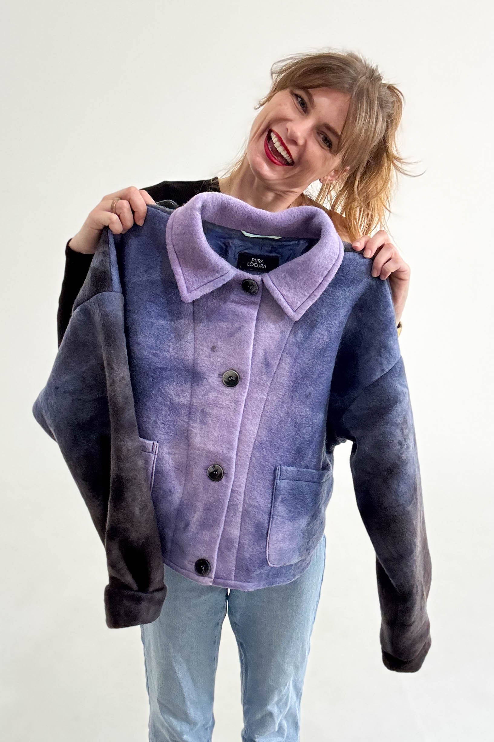 Shacket ÚNICO je kousek, který vás okamžitě zaujme svým originálním batikovaným přechodem v tónech hnědé, šedé, fialové a modré 🌌. Ušitý z kvalitní vlněné kabátoviny, nabídne hřejivost, styl a výjimečnost, kterou nikde jinde nenajdete. 🧥💫