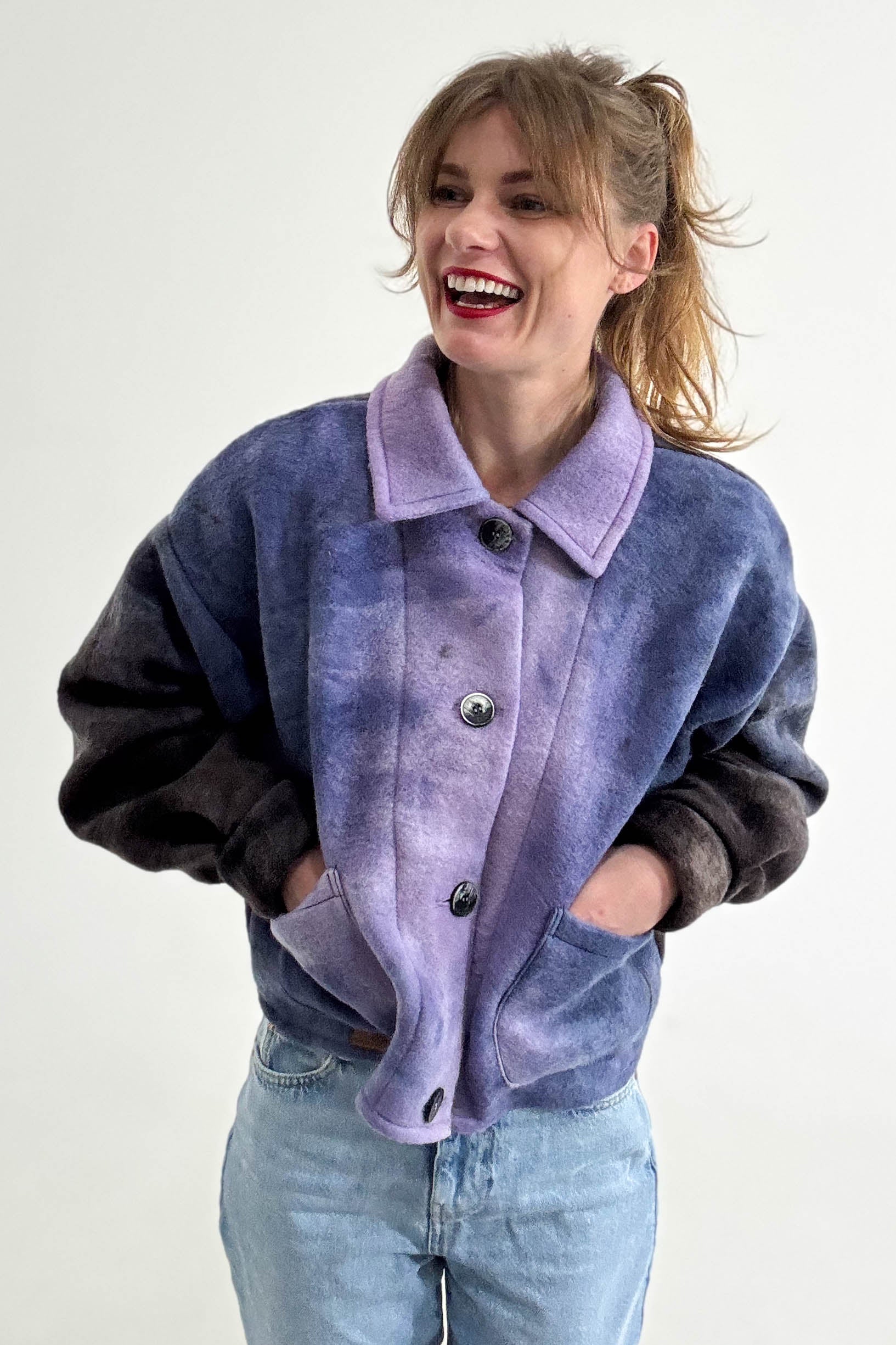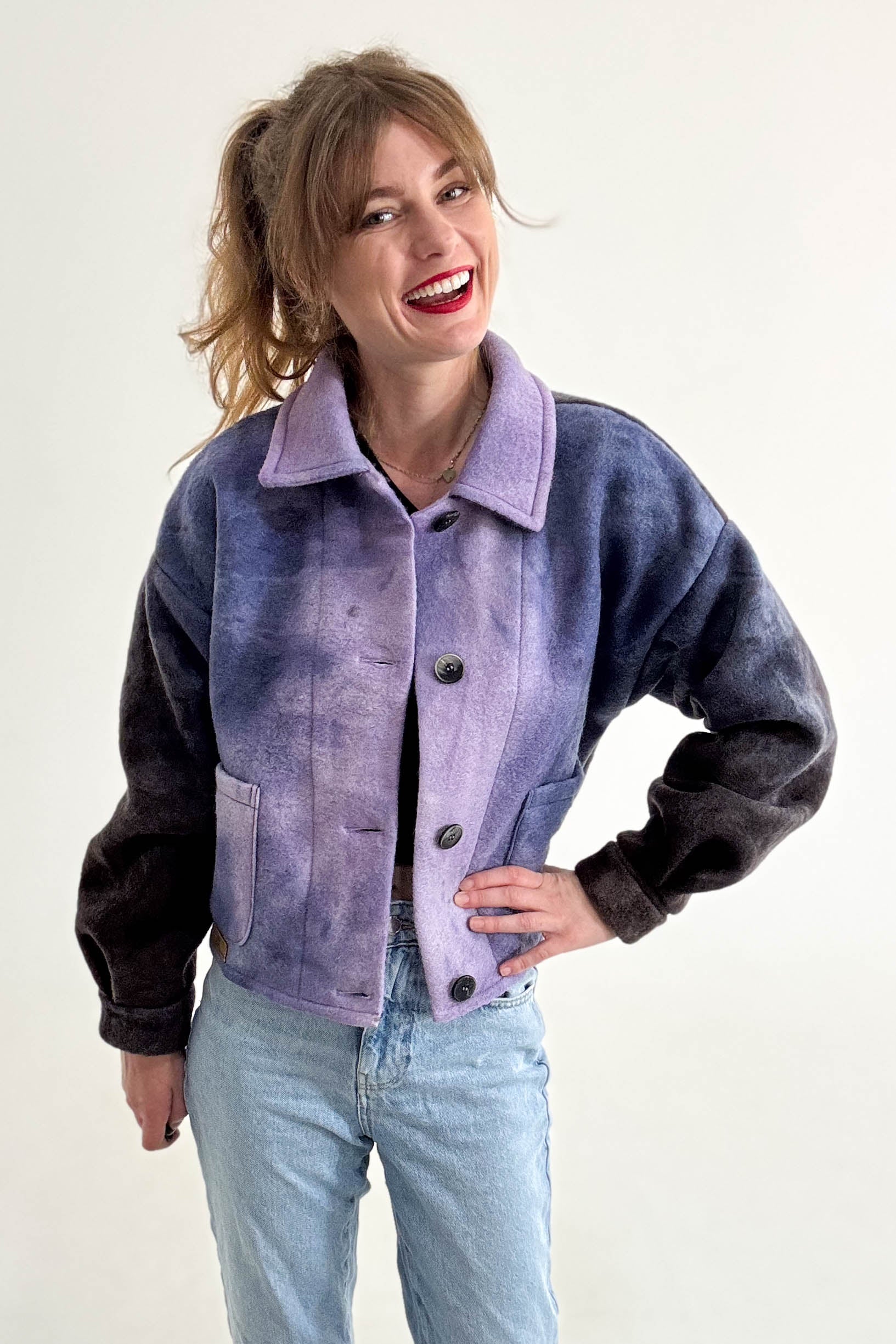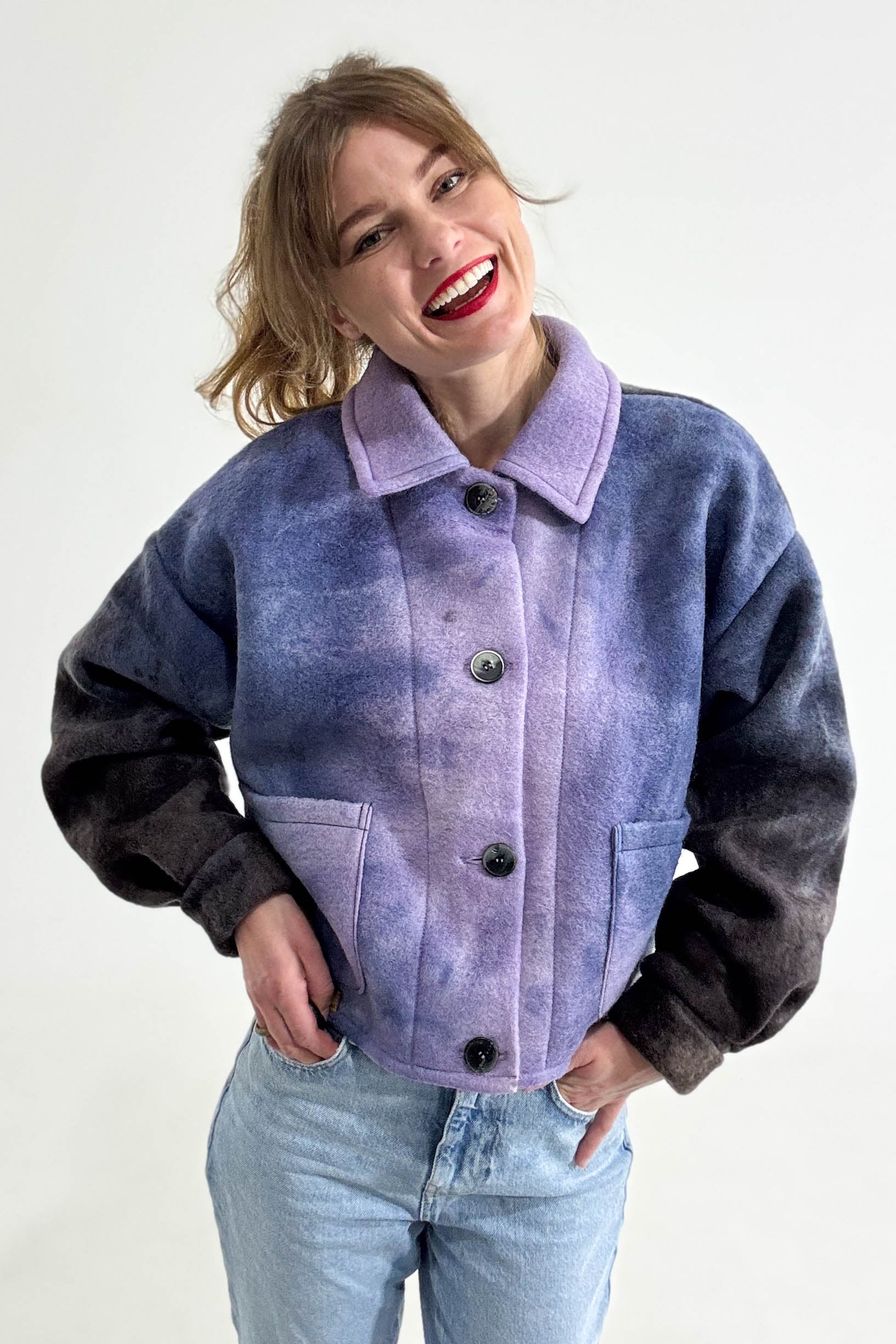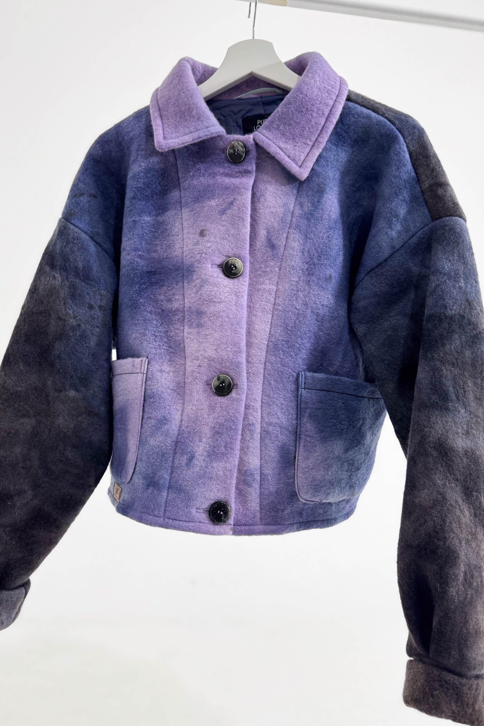 Shacket ÚNICO je kousek, který vás okamžitě zaujme svým originálním batikovaným přechodem v tónech hnědé, šedé, fialové a modré 🌌. Ušitý z kvalitní vlněné kabátoviny, nabídne hřejivost, styl a výjimečnost, kterou nikde jinde nenajdete. 🧥💫