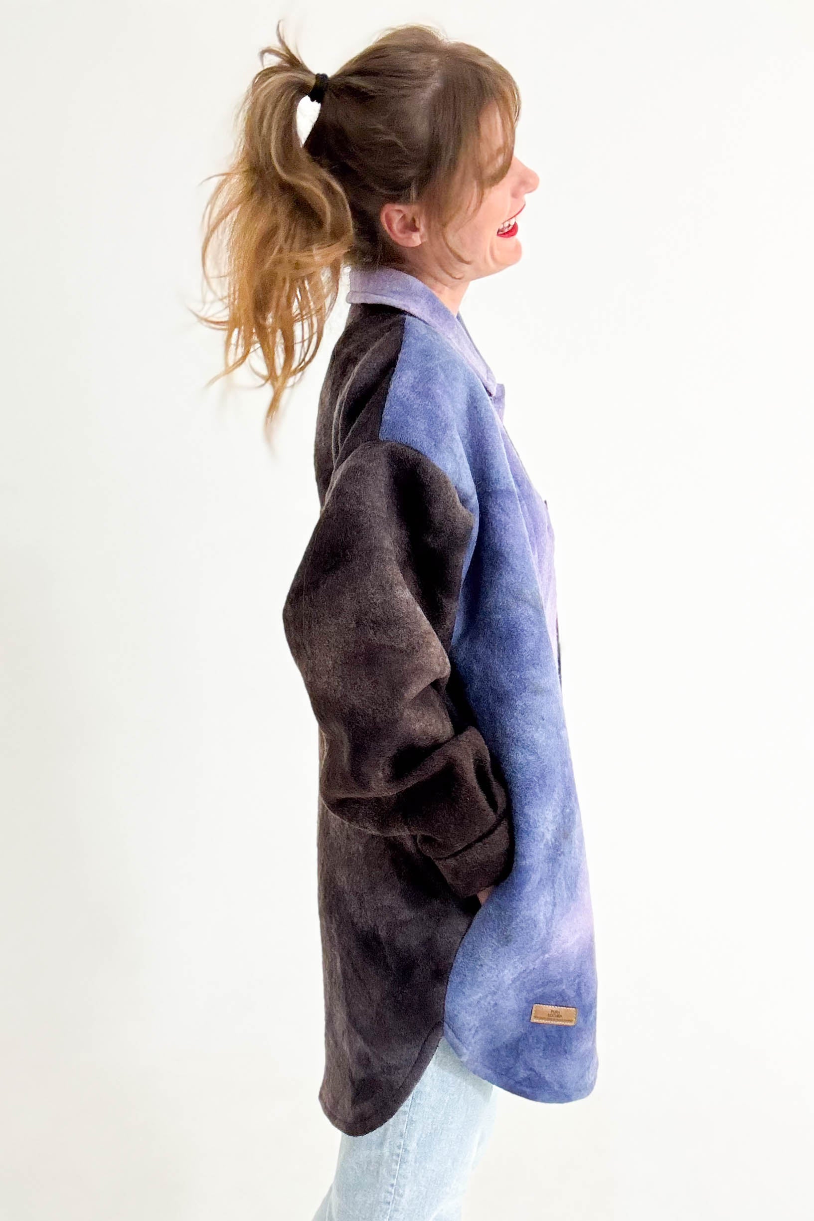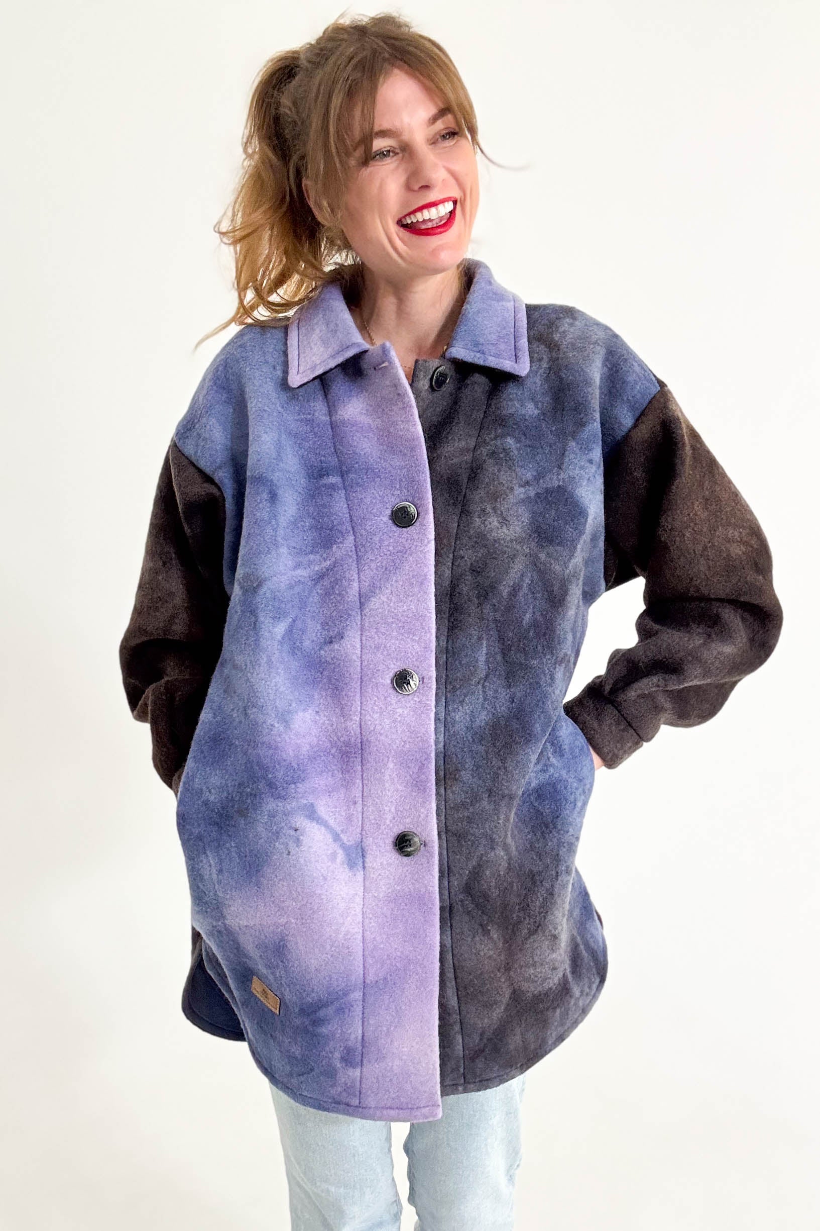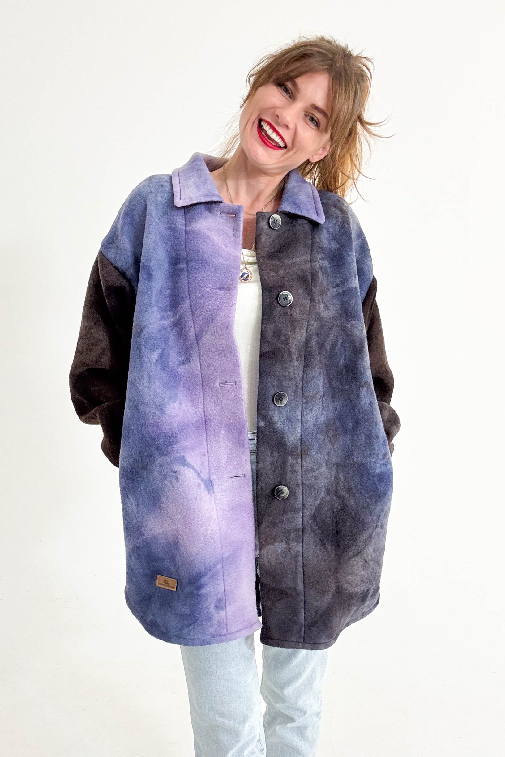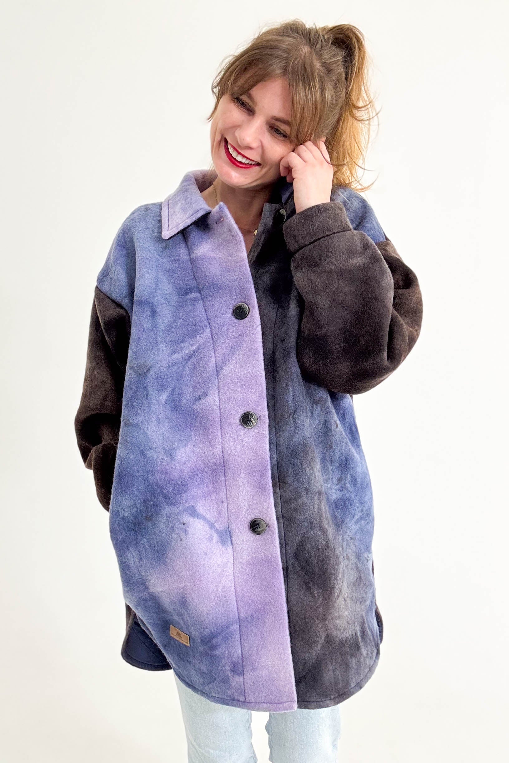 Shacket ÚNICO je kousek, který vás okamžitě zaujme svým originálním batikovaným přechodem v tónech hnědé, šedé, fialové a modré 🌌. Ušitý z kvalitní vlněné kabátoviny, nabídne hřejivost, styl a výjimečnost, kterou nikde jinde nenajdete. 🧥💫