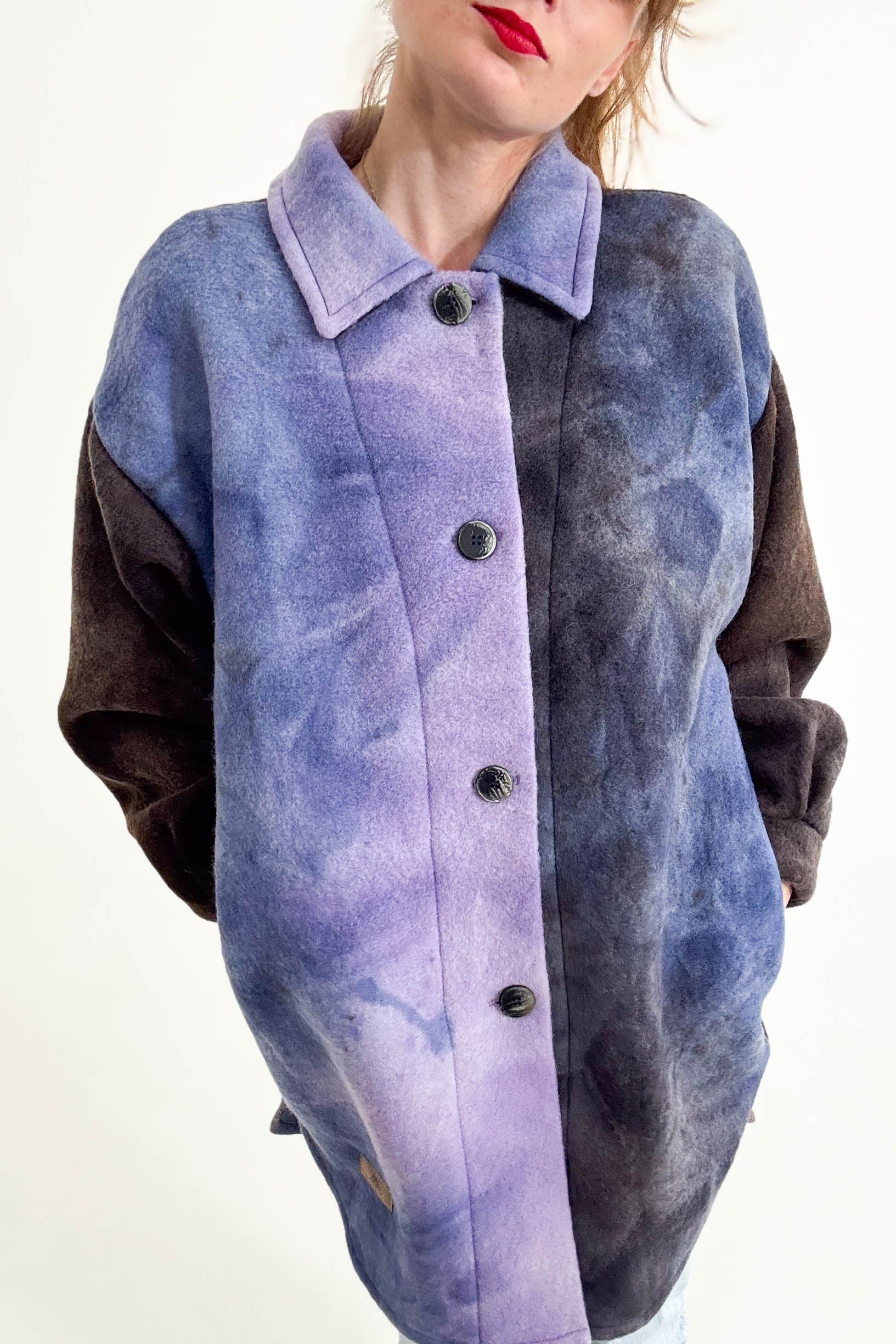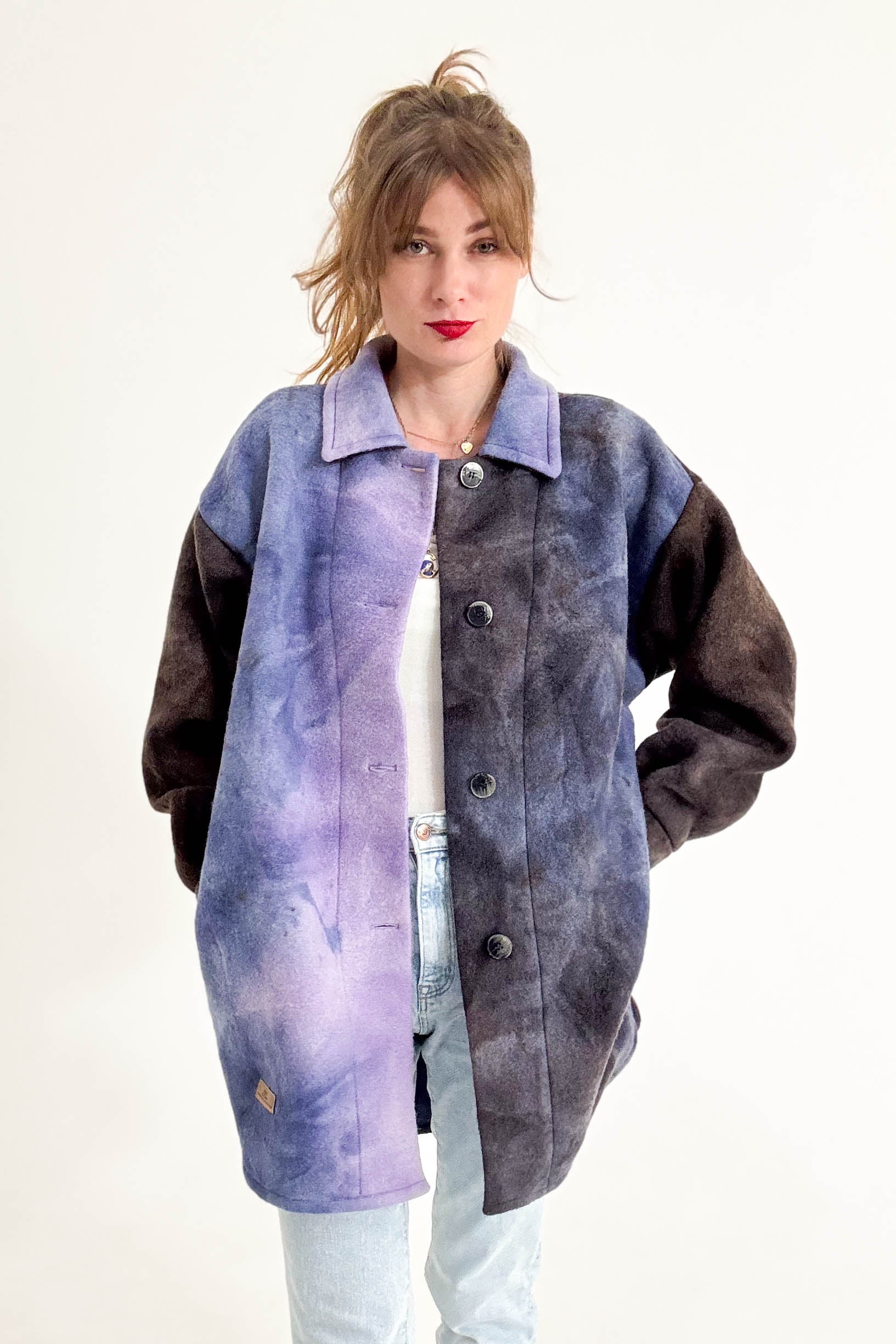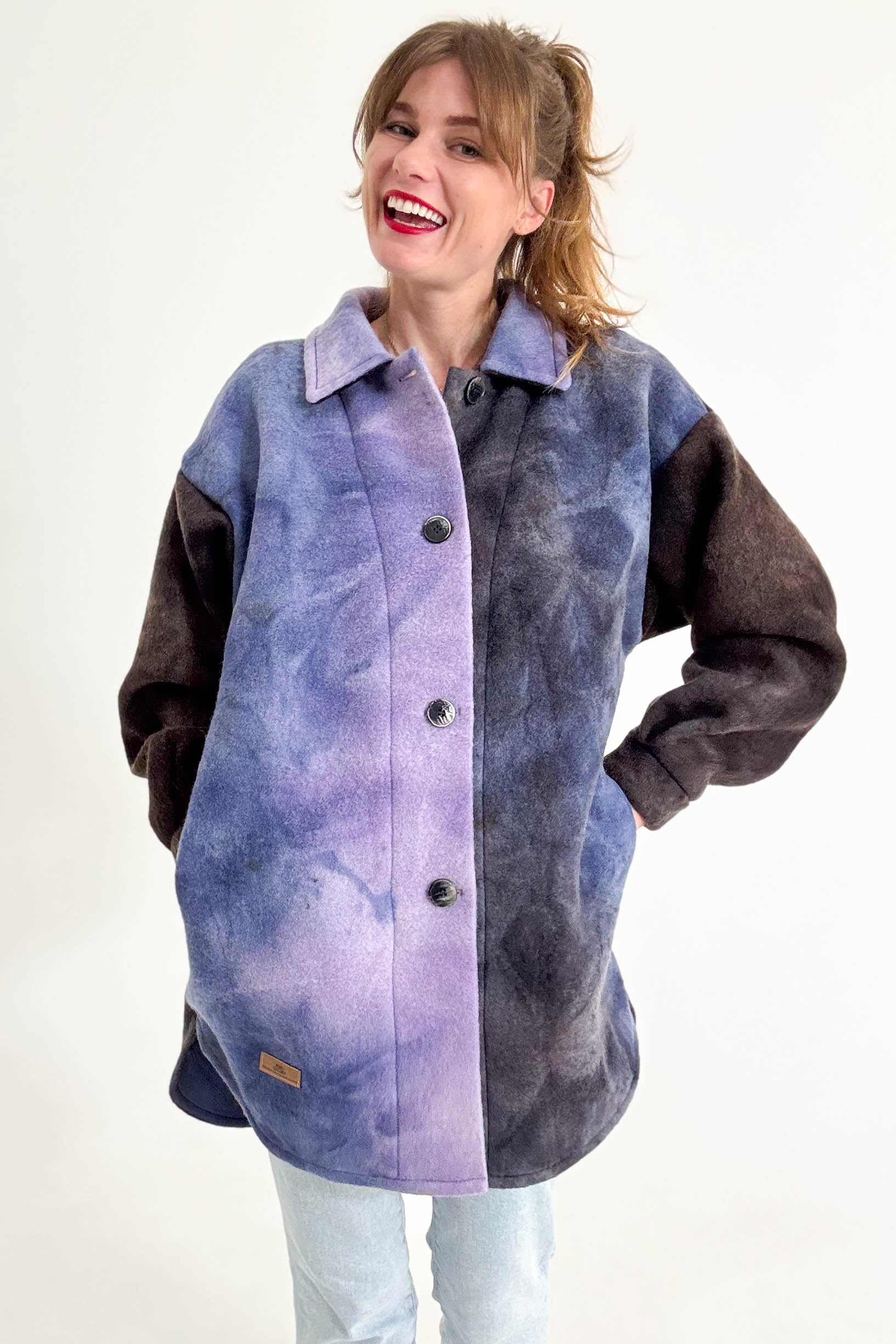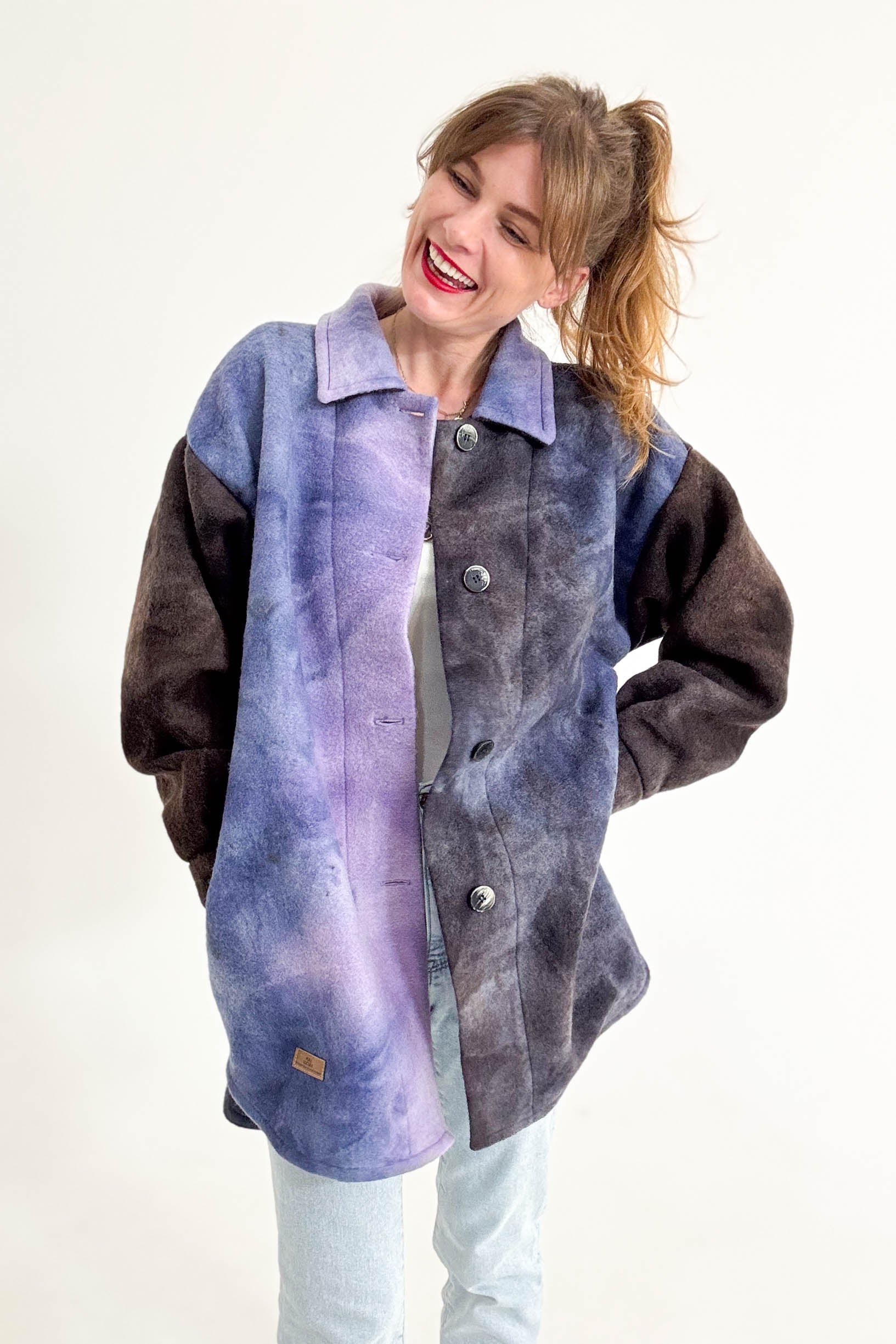 Shacket ÚNICO je kousek, který vás okamžitě zaujme svým originálním batikovaným přechodem v tónech hnědé, šedé, fialové a modré 🌌. Ušitý z kvalitní vlněné kabátoviny, nabídne hřejivost, styl a výjimečnost, kterou nikde jinde nenajdete. 🧥💫