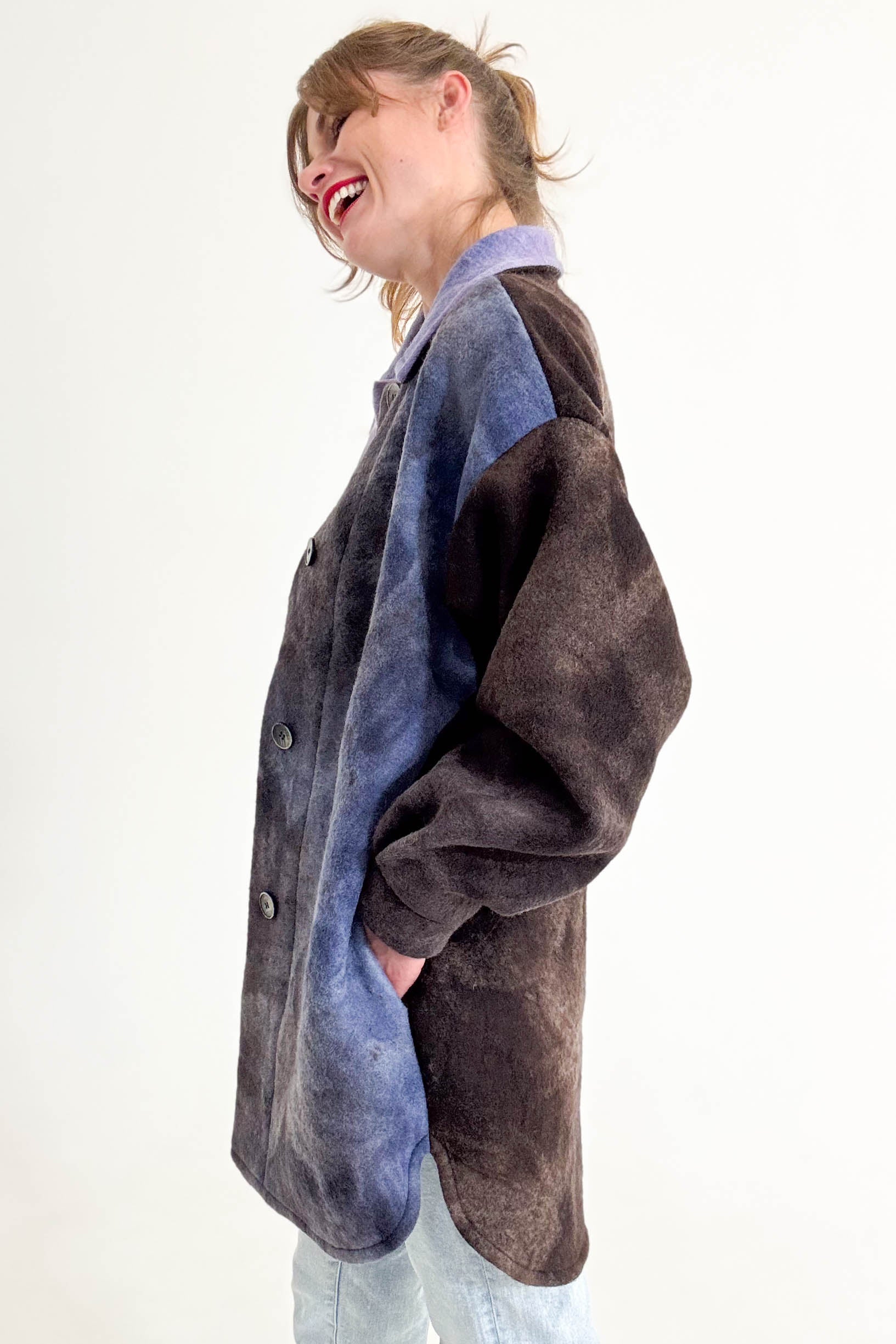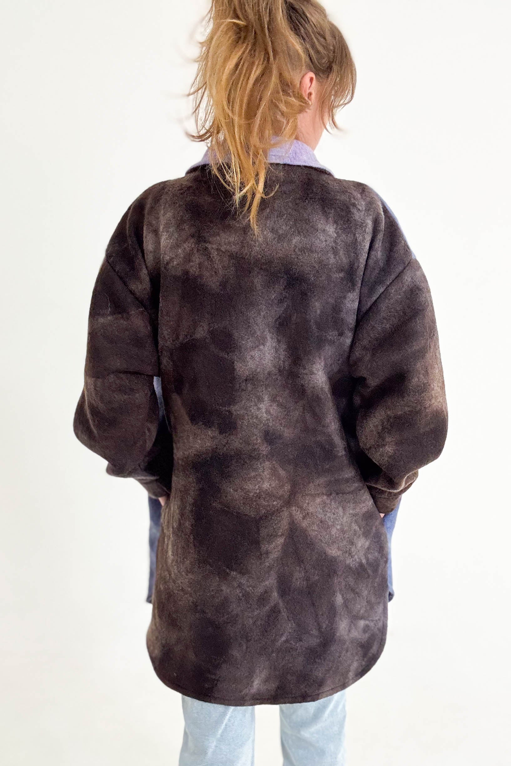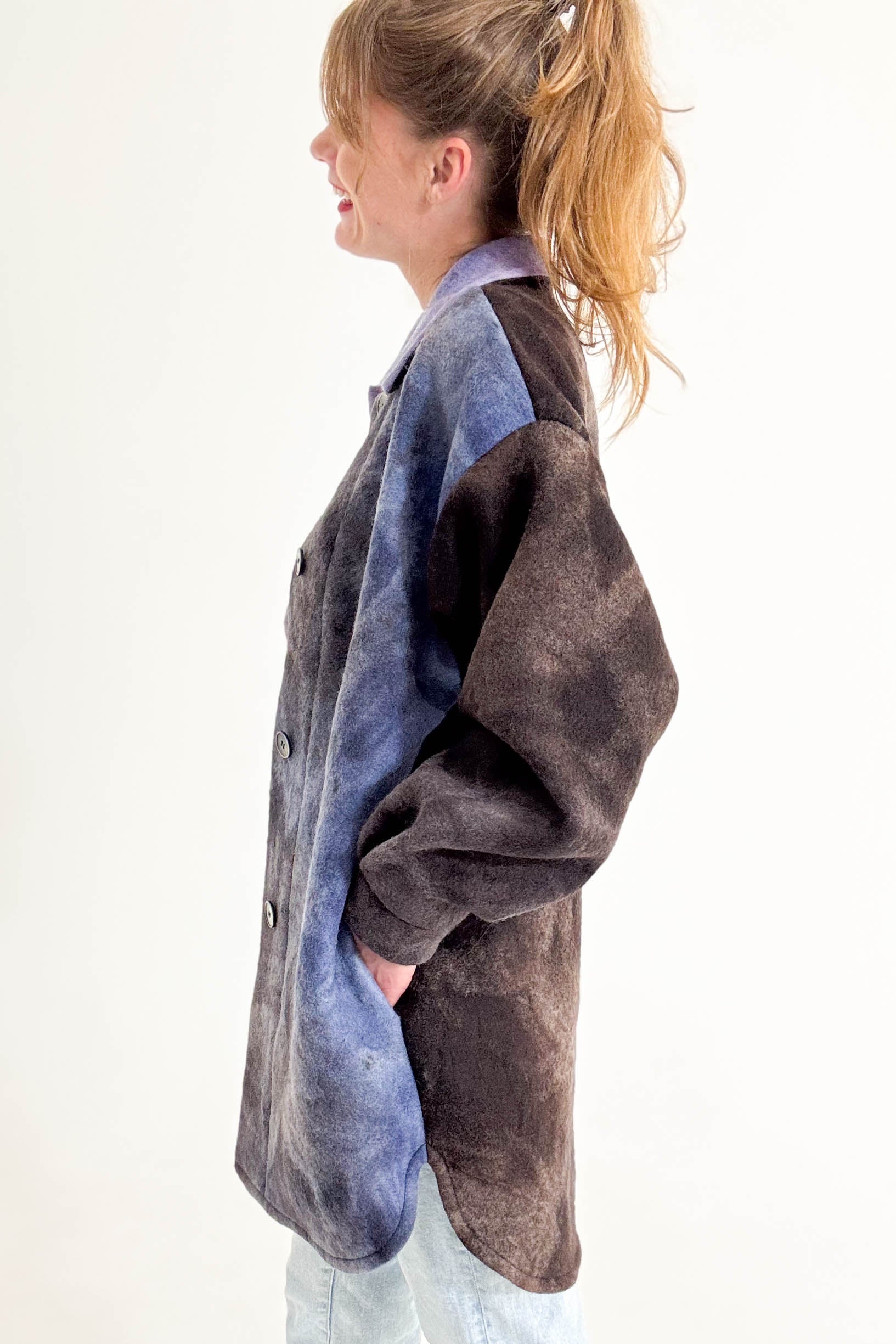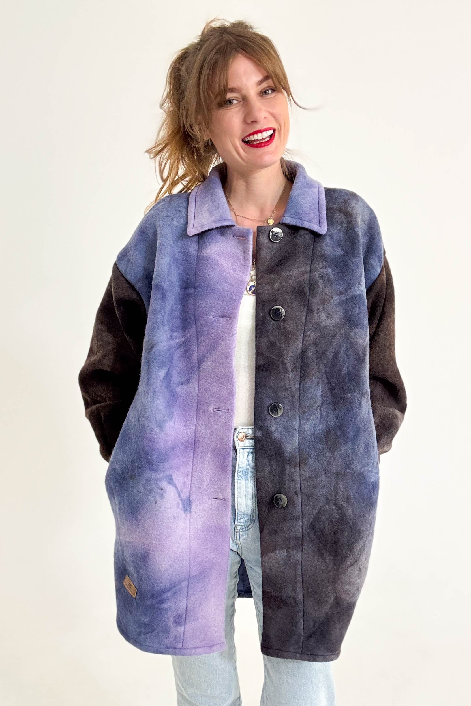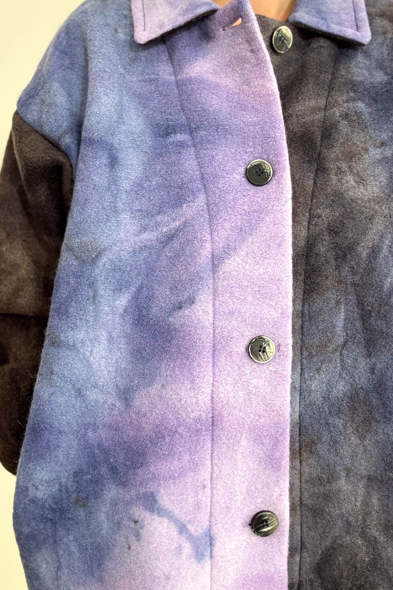 Shacket ÚNICO je kousek, který vás okamžitě zaujme svým originálním batikovaným přechodem v tónech hnědé, šedé, fialové a modré 🌌. Ušitý z kvalitní vlněné kabátoviny, nabídne hřejivost, styl a výjimečnost, kterou nikde jinde nenajdete. 🧥💫